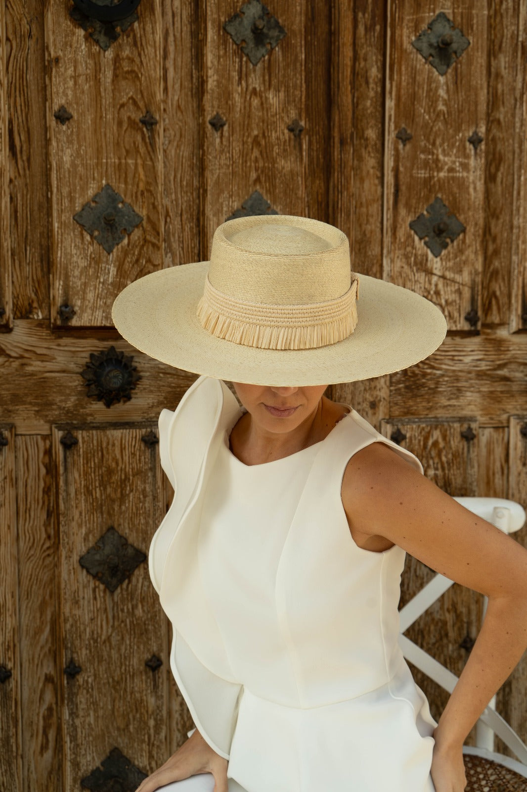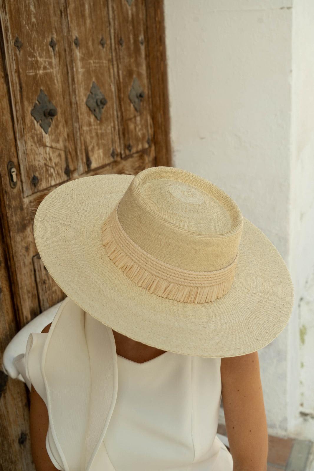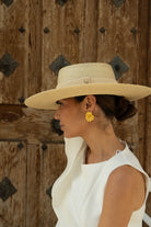 Braided straw boater hat made in Spain. Brim between 10.5- 13 cm. approx, cup height 5 cm. approx. Total diameter 44x42 cm approx. In natural color.
