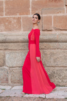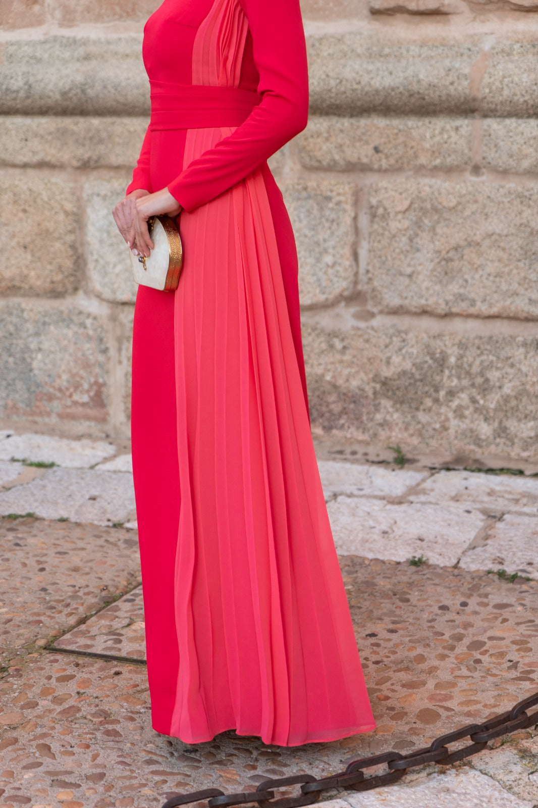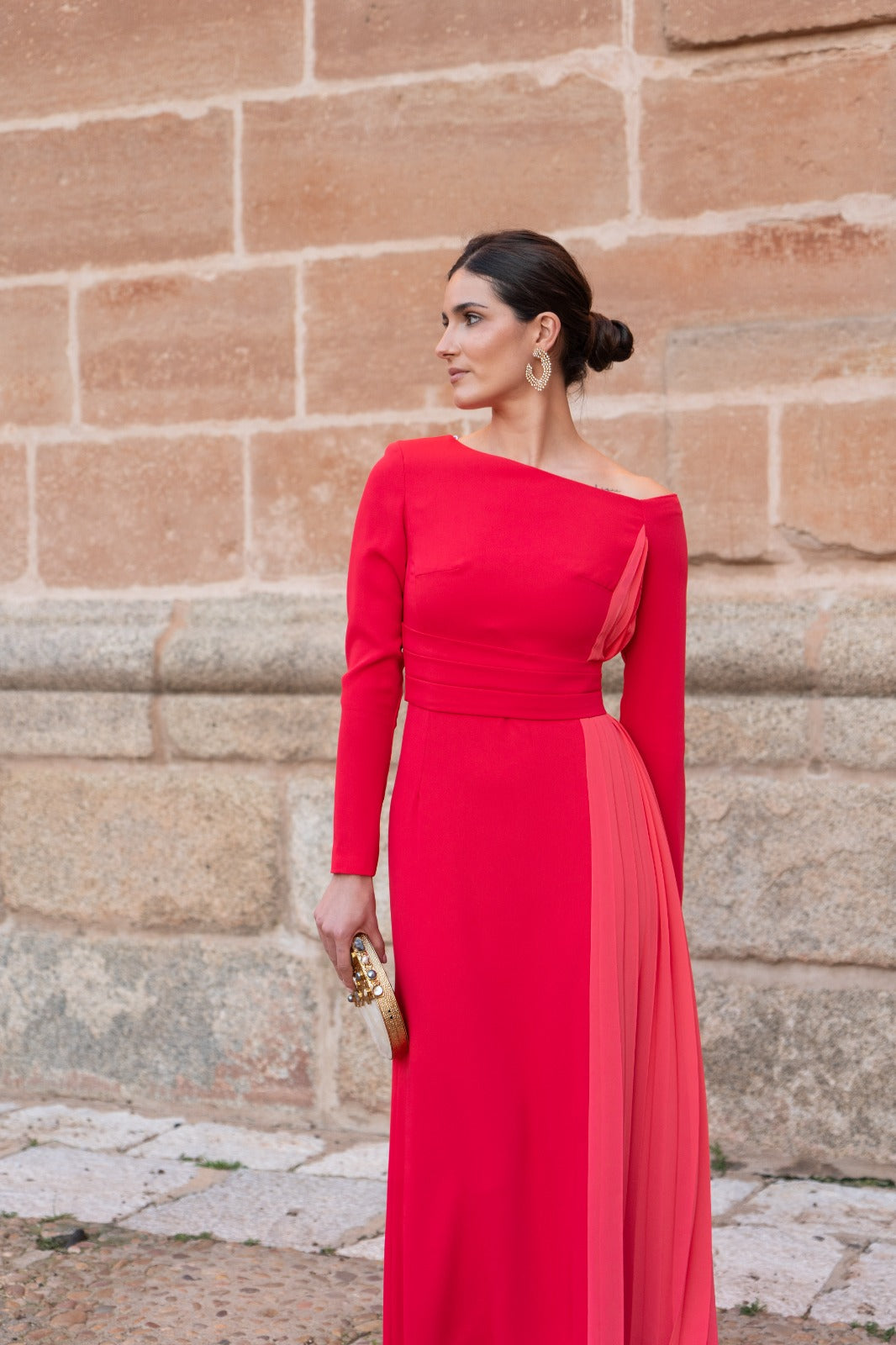 Vestido largo, escote asimétrico, corte en cintura con cinturón, manga larga, caída plisada en un lado. En color frambuesa.