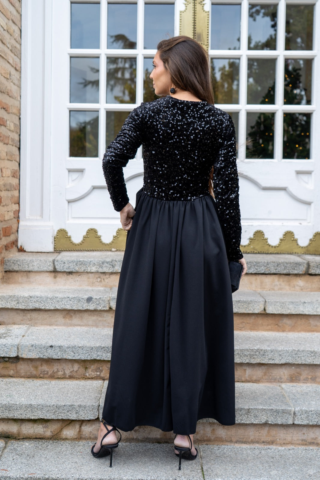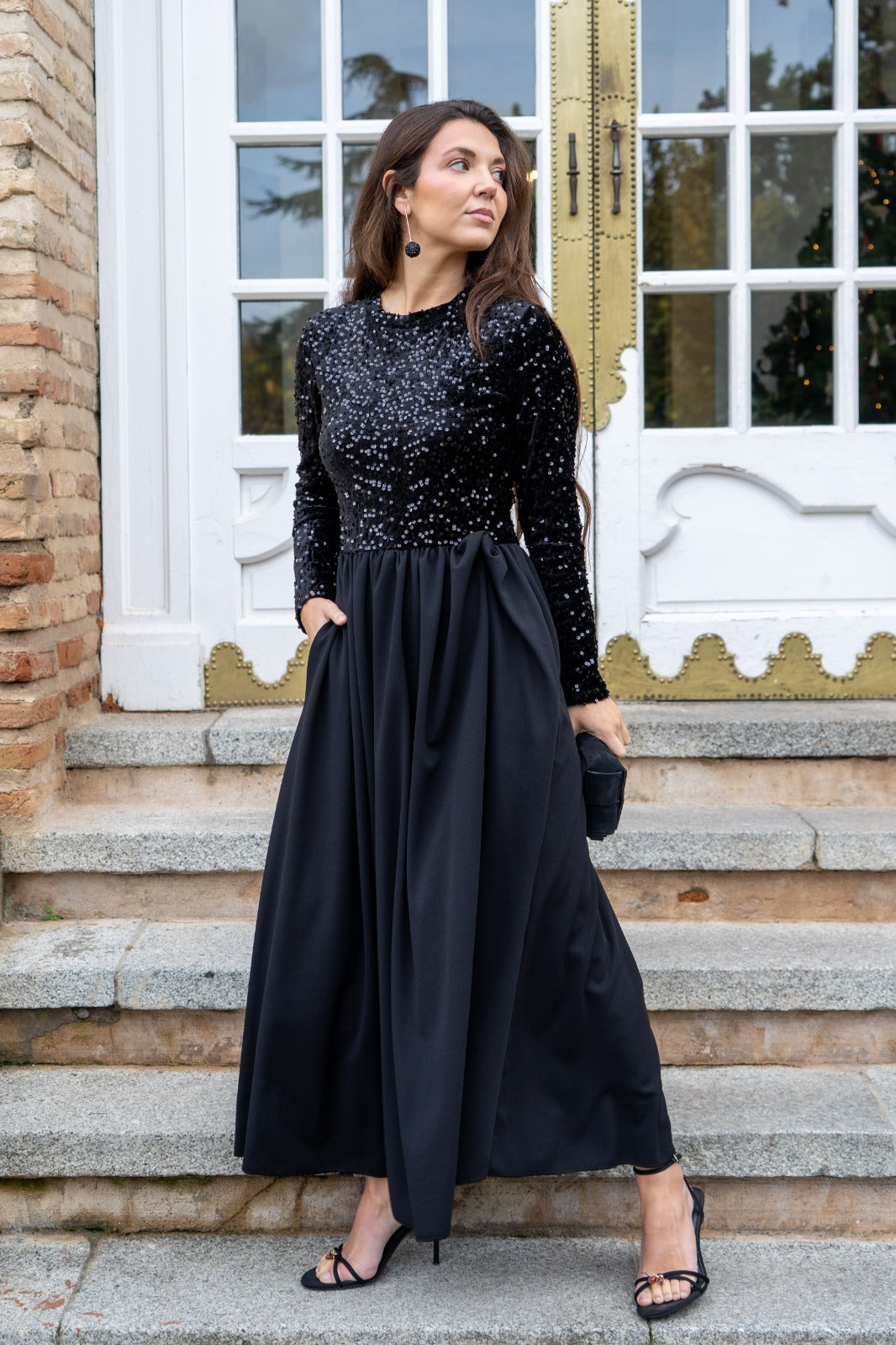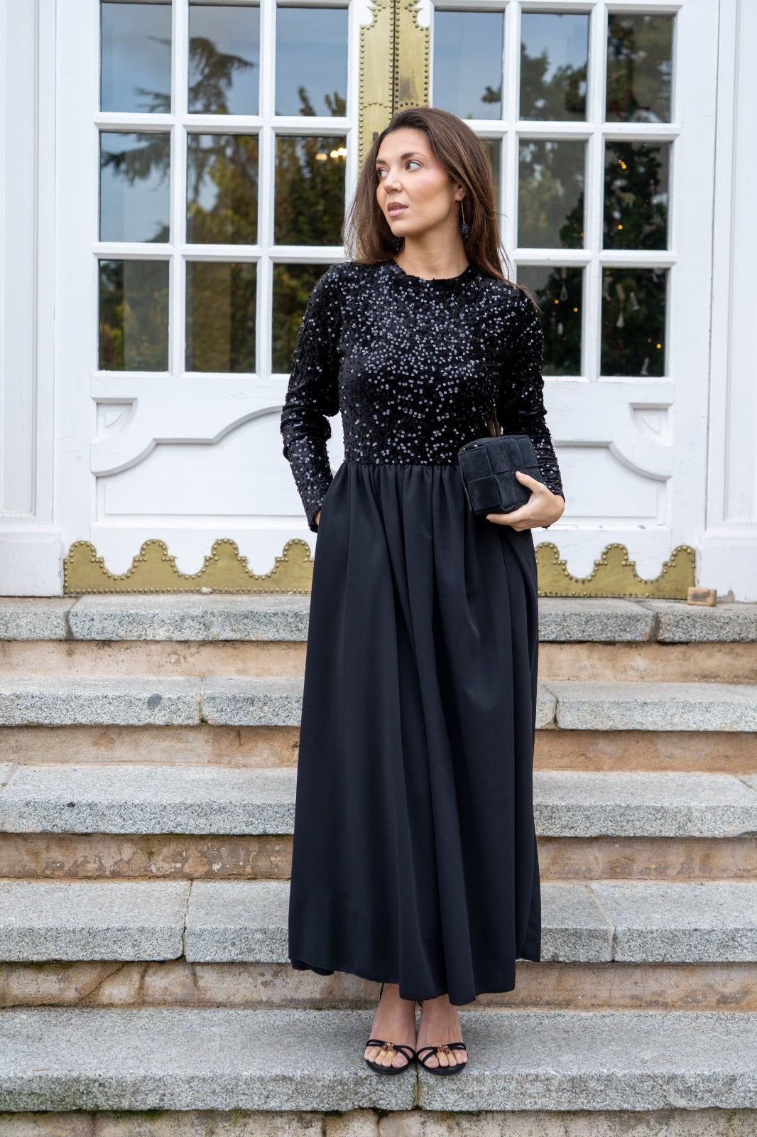 Vestido midi, escote redondo, manga larga, corte en cintura, en color negro, parte de arriba con lentejuelas.