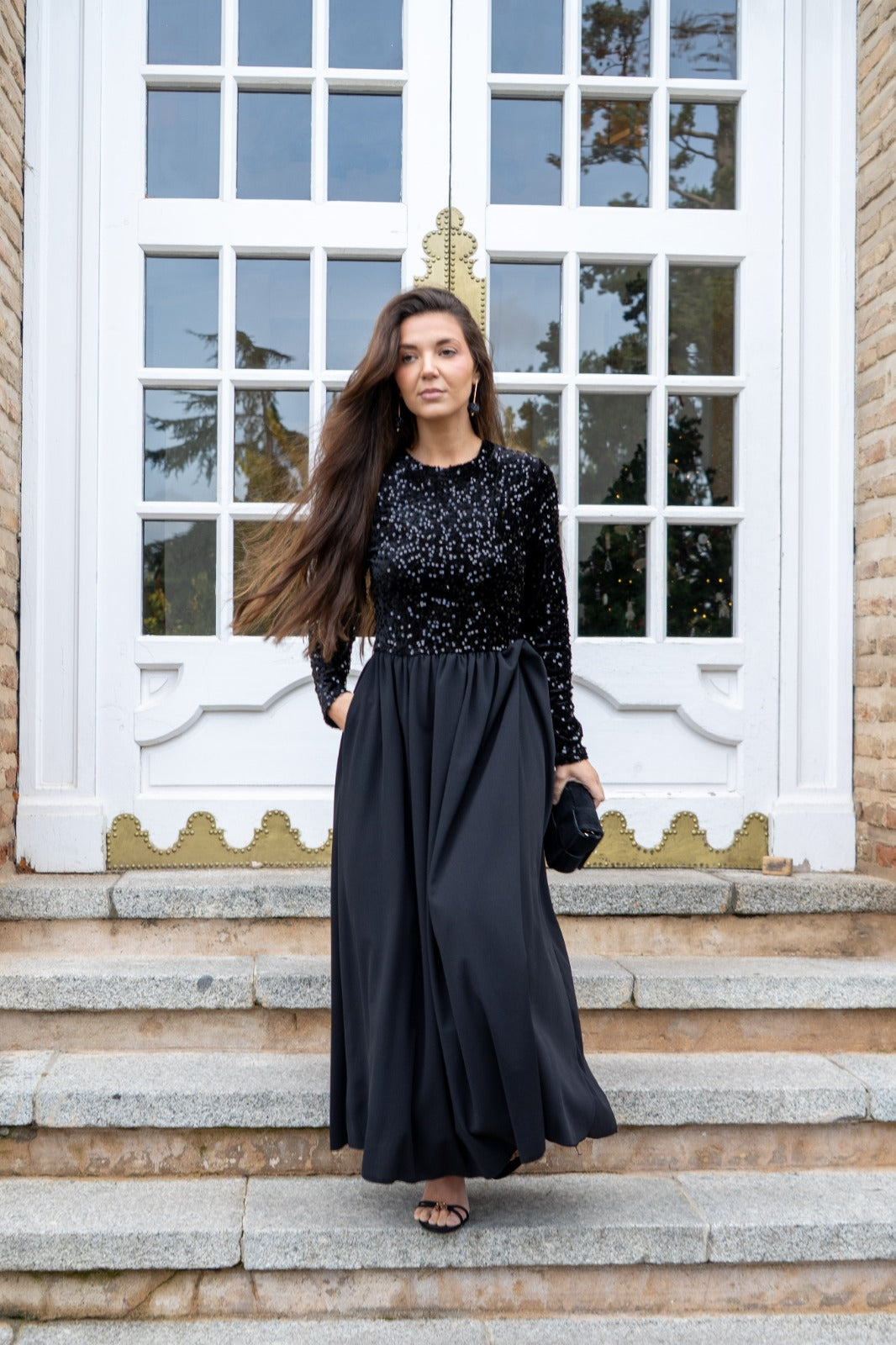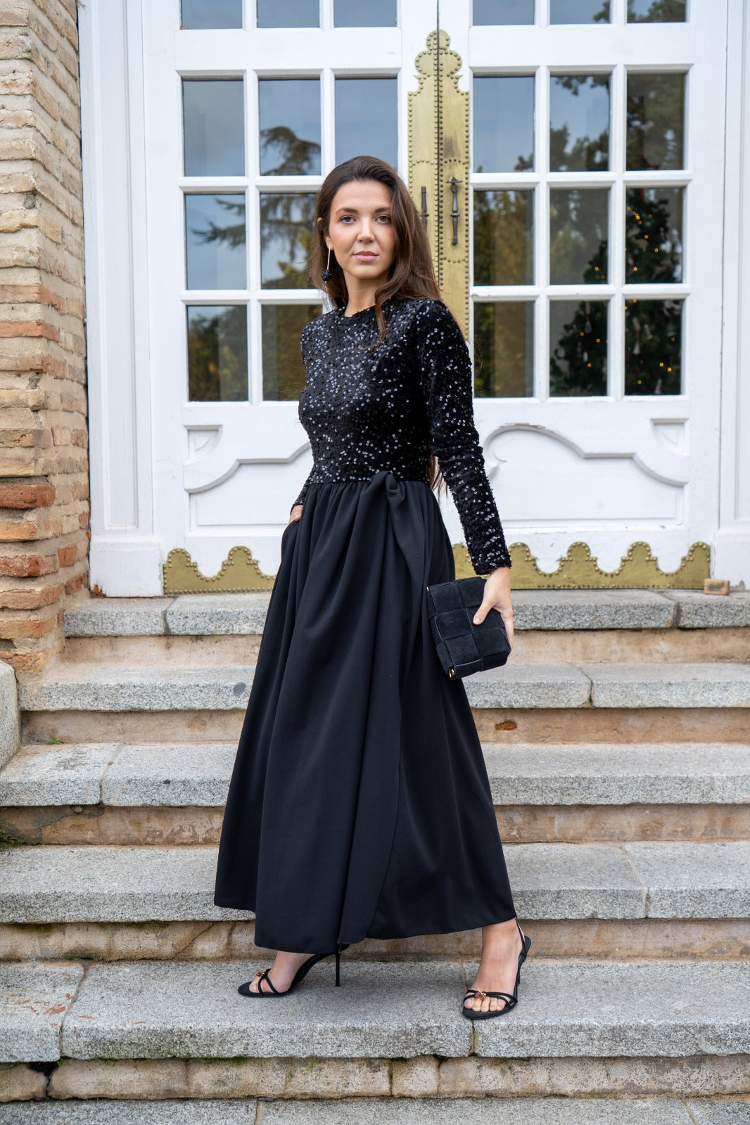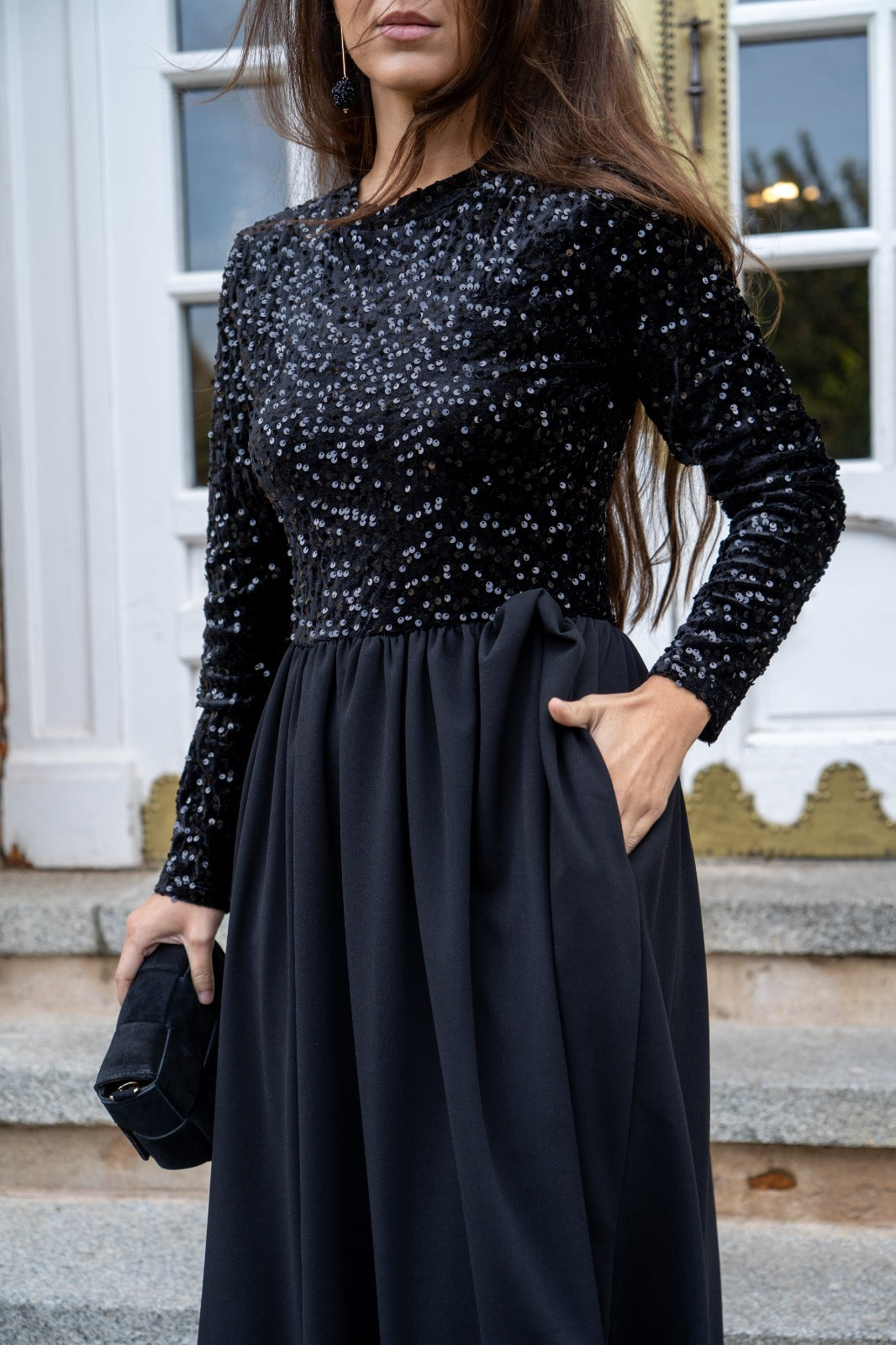 Vestido midi, escote redondo, manga larga, corte en cintura, en color negro, parte de arriba con lentejuelas.
