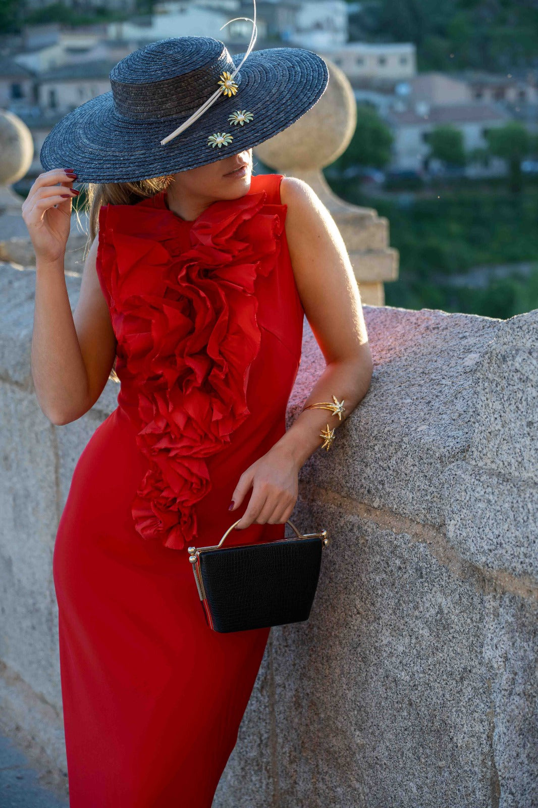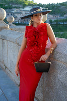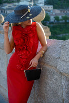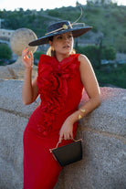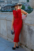 Midi dress with a round neckline and a carnation-inspired ruffle. Sleeveless and slit in the back. In red.