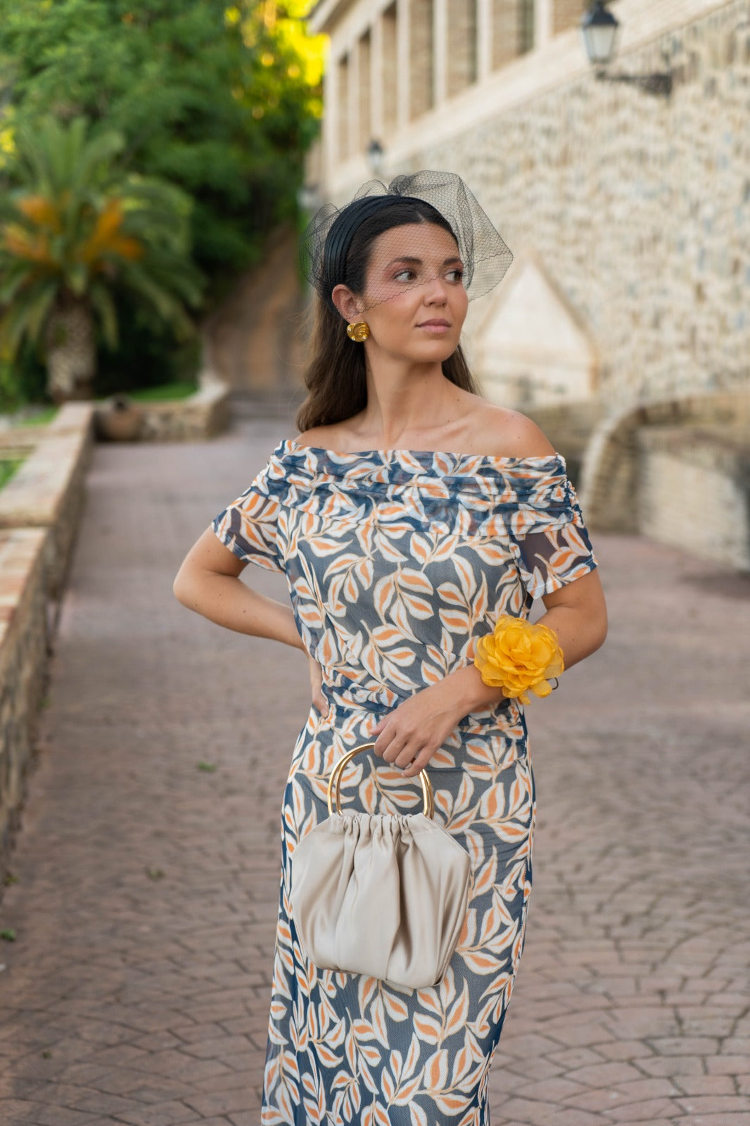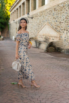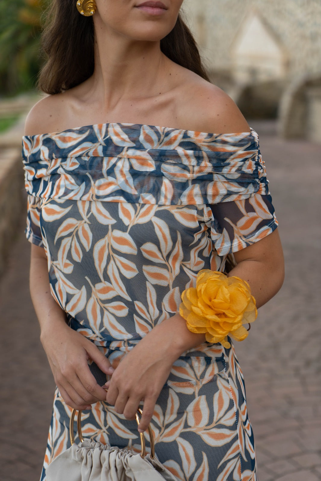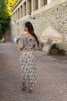 Off-the-shoulder midi dress with short sleeves and a fully elasticated waist. Available in beige and navy.