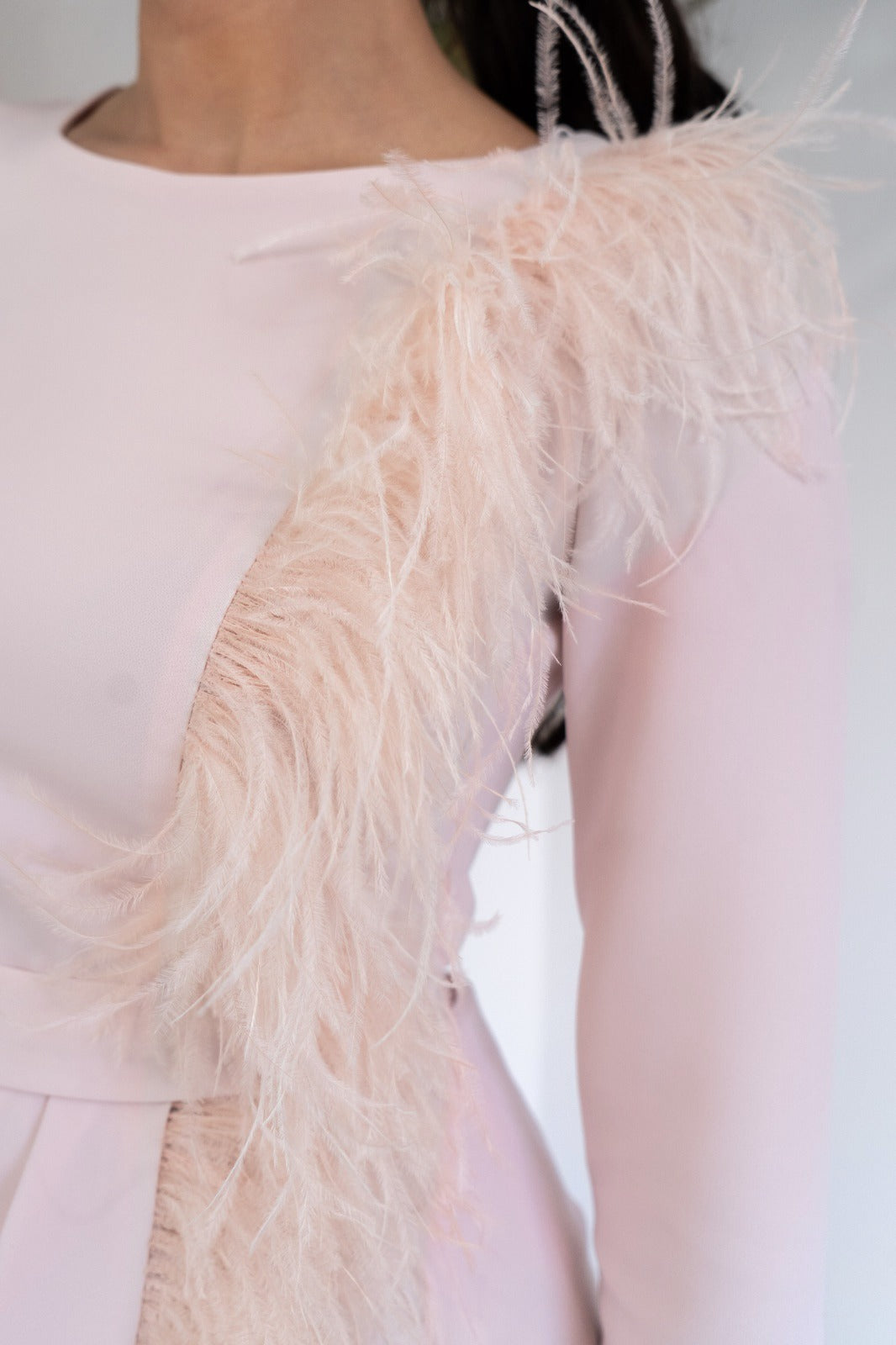 Midi dress, round neckline, three-quarter sleeves, fitted waist with sash, feather detail from shoulder to hem. In pink.