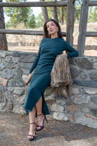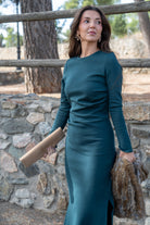 Knitted dress, round neckline, long sleeves, side slits, in green.