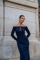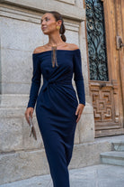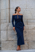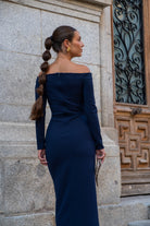 Midi dress, boat neckline, three-quarter sleeves, with a knot at the waist on one side. In blue.