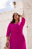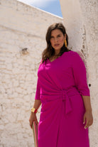 Flowing dress with a V-neckline, three-quarter sleeves, and a buckled side sash. In pink.