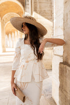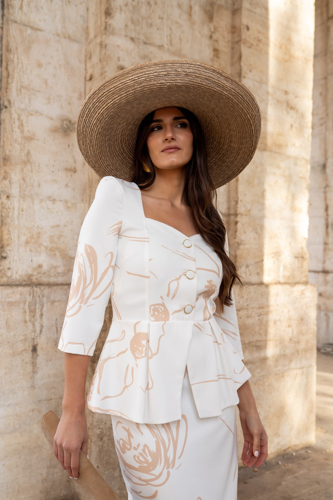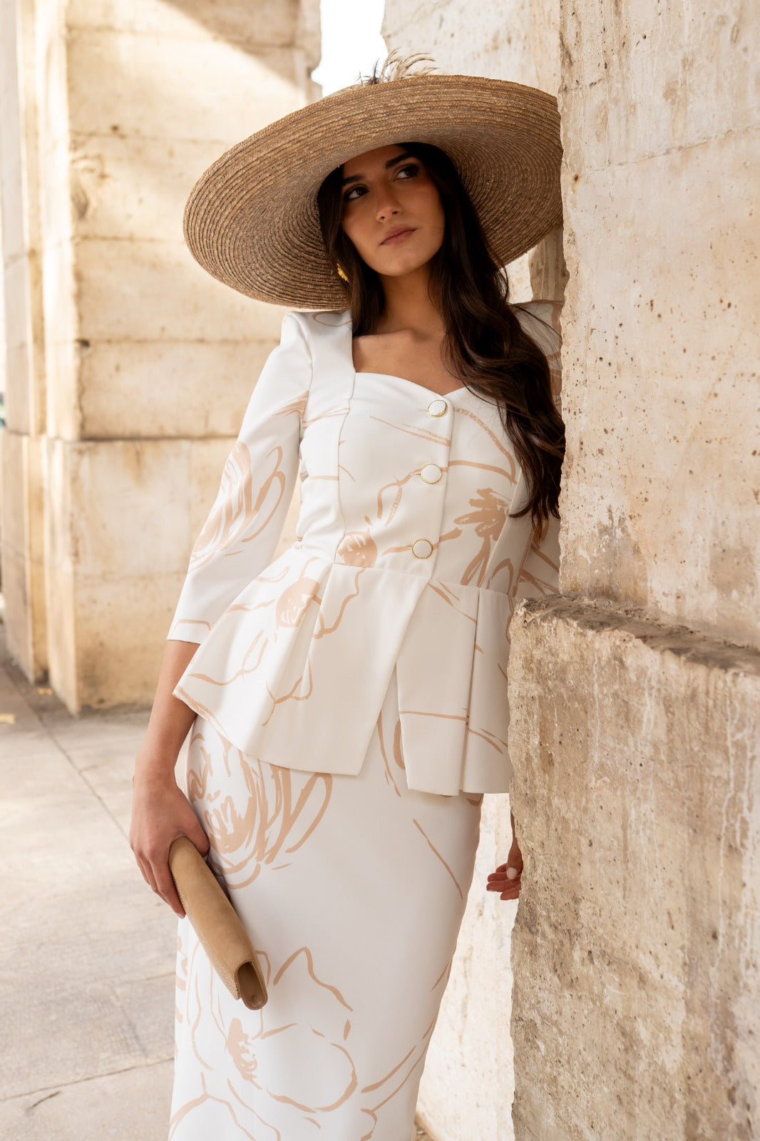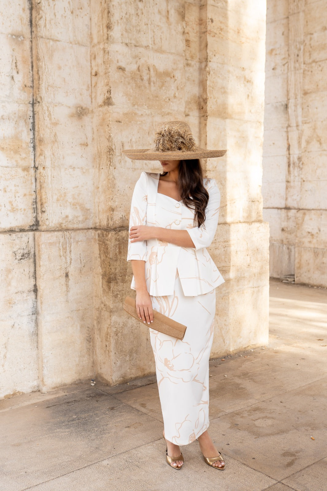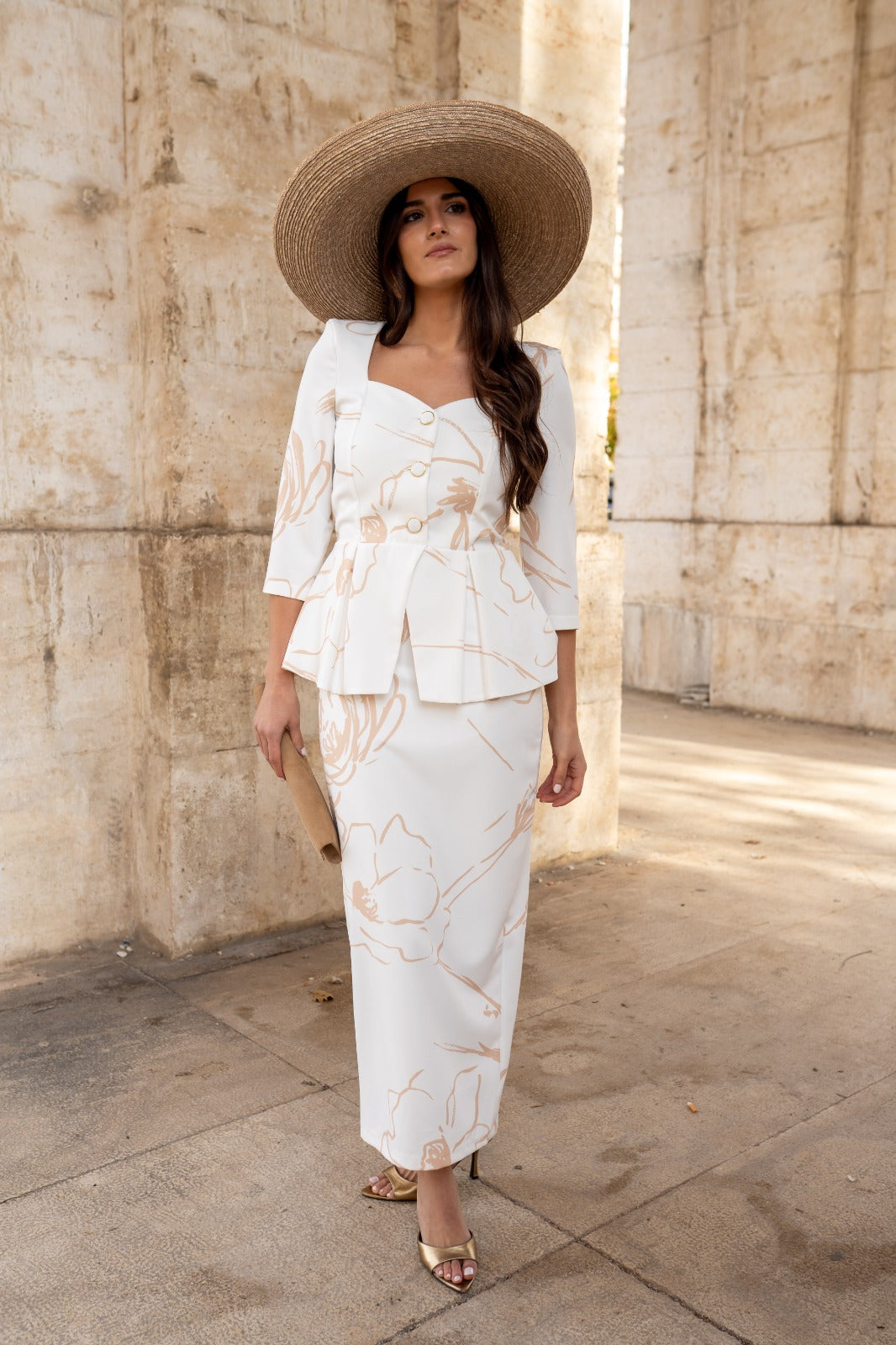 Maxi midi dress, sweetheart neckline, three-quarter sleeves, peplum waist, button closure, back slit. In white with camel print.