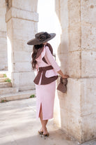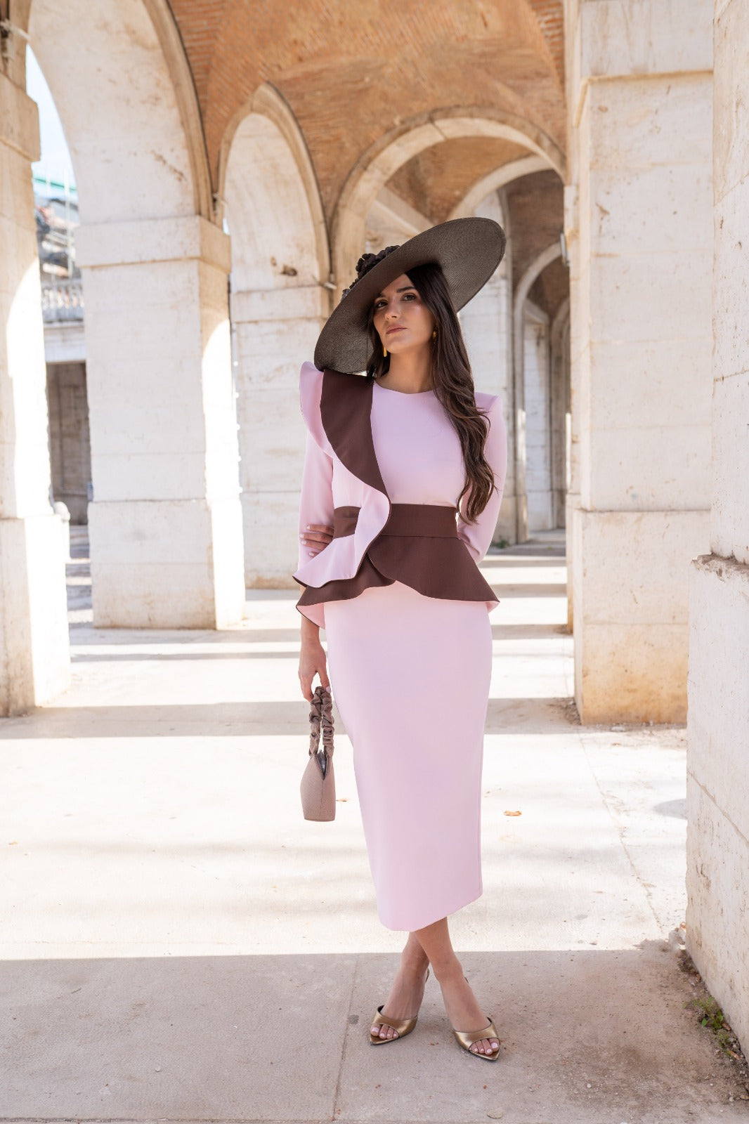Midi dress, round neckline, three-quarter sleeves, ruffle at shoulder and waist, back slit. Two-tone pink and brown.