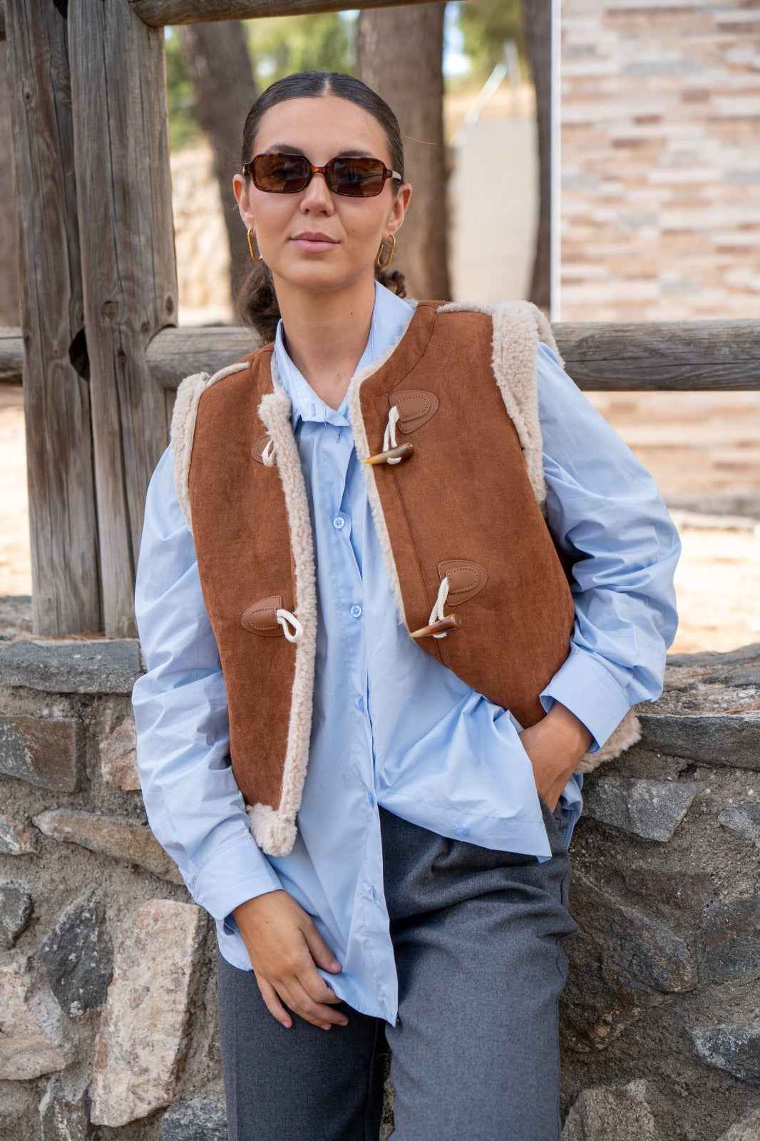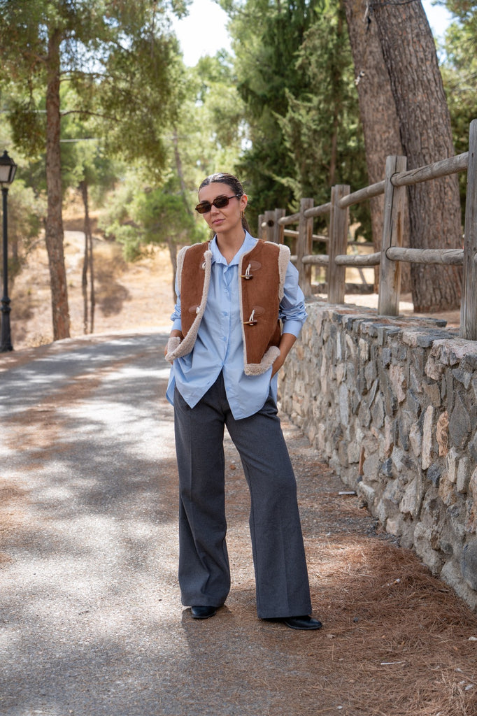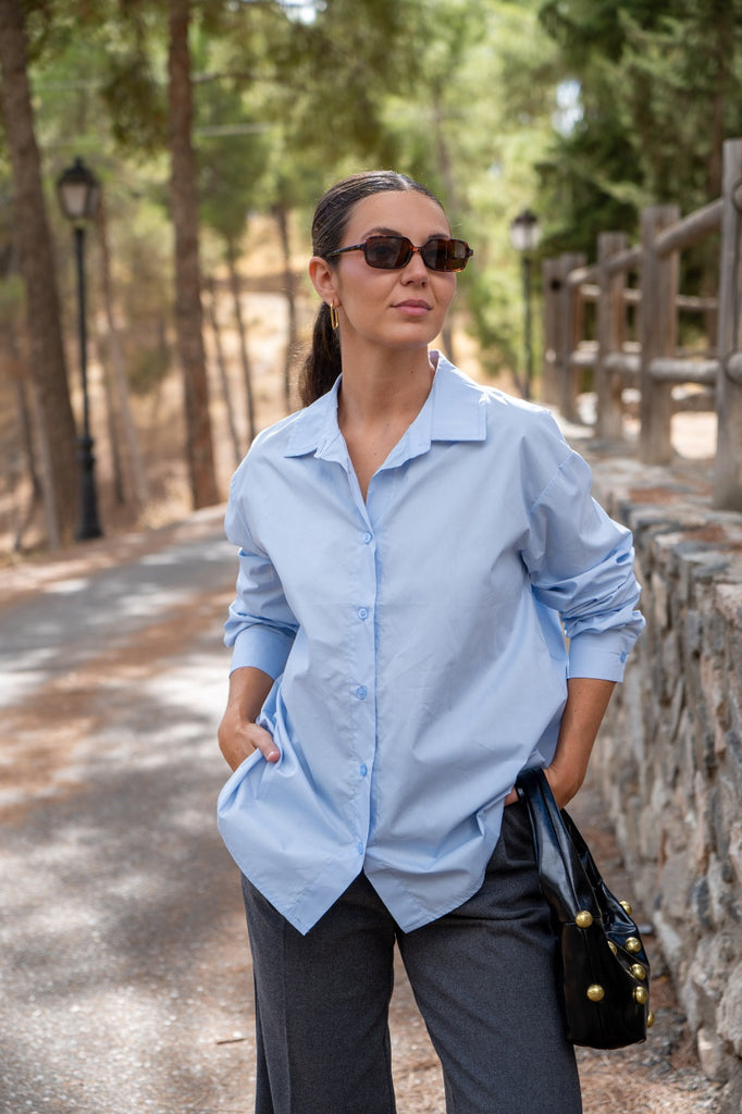 Camisa básica, manga larga con puño, abotonada delante y abotonada y lazo en la parte de atrás. En color azul.