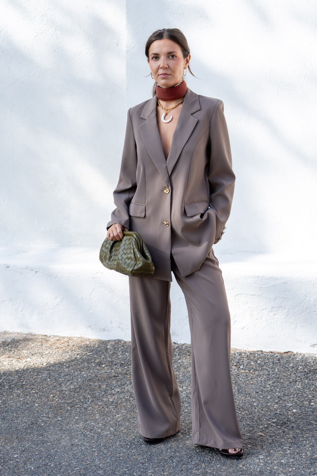 Conjunto compuesto por chaqueta, cuello solapa, bolsillos delanteros y pantalon ancho, bolsillos laterales. Tejido fluido en color verde.