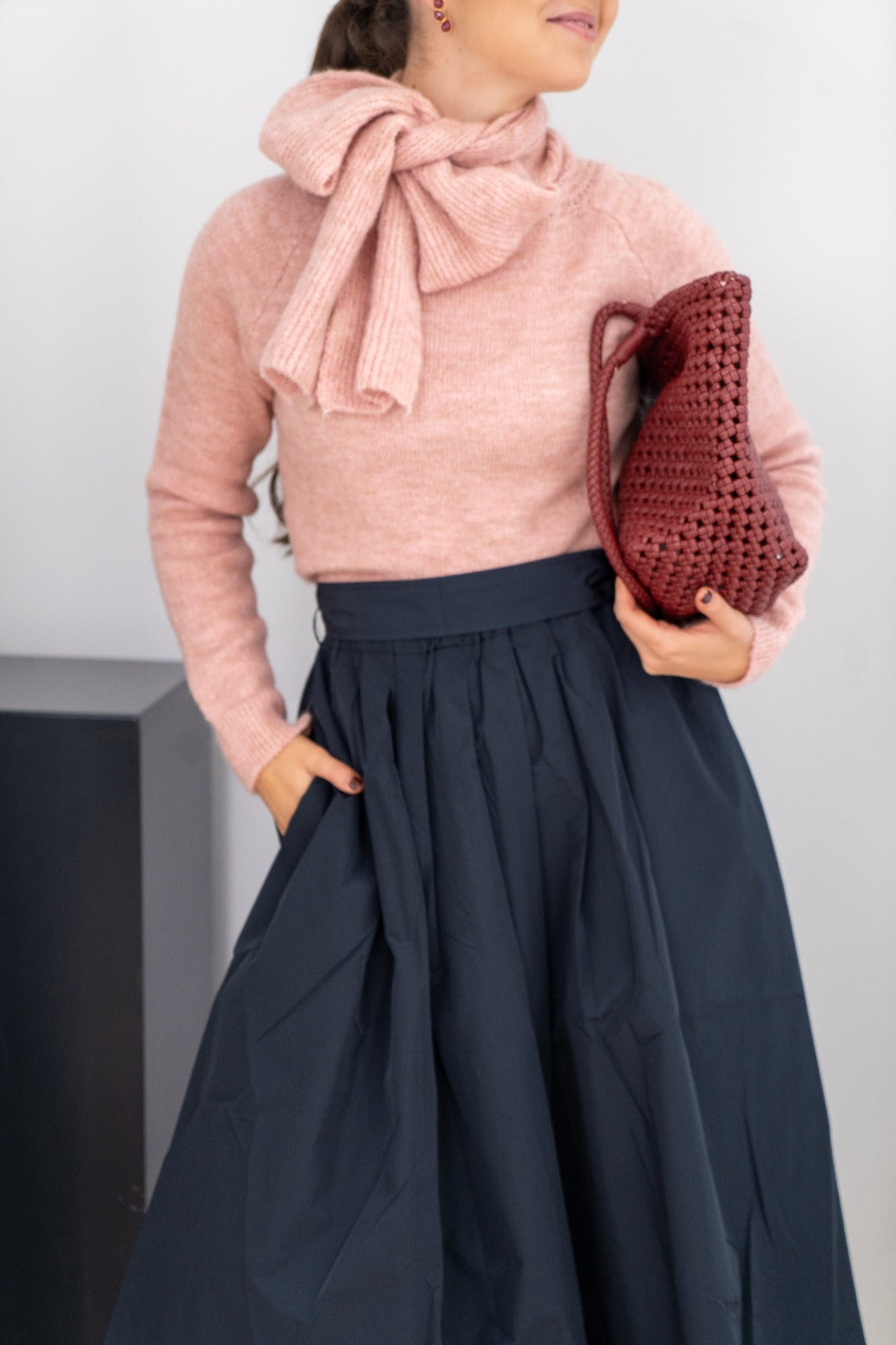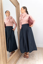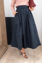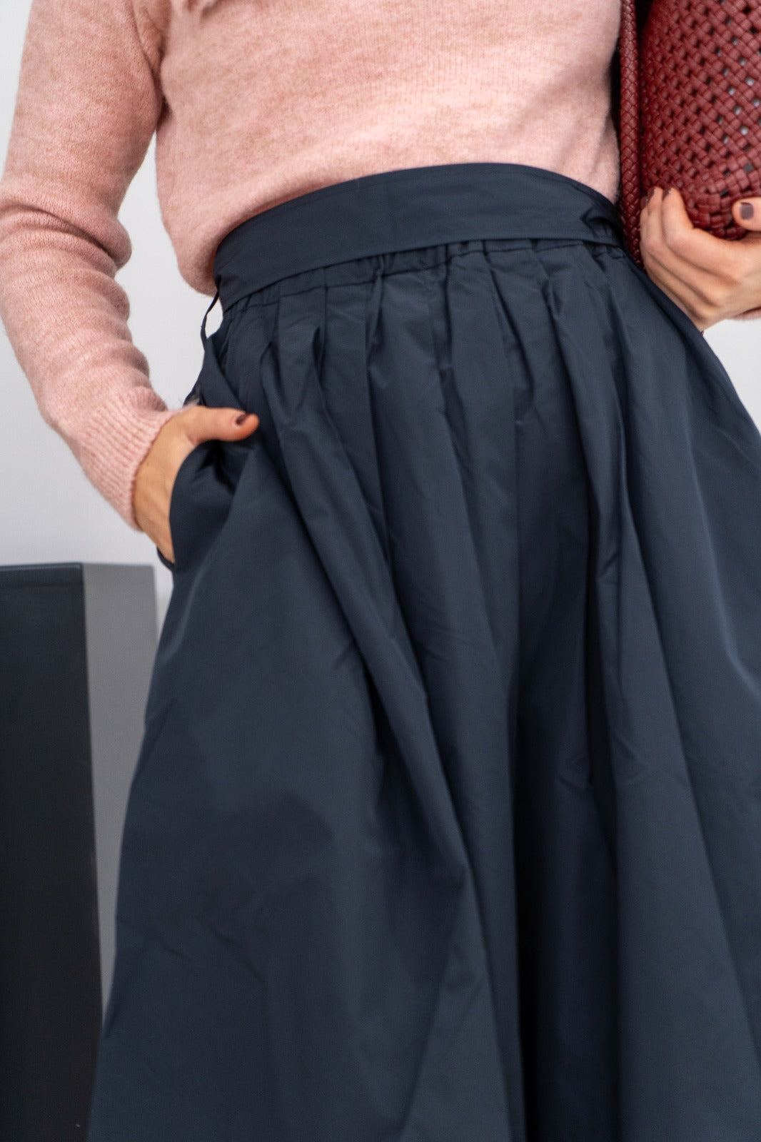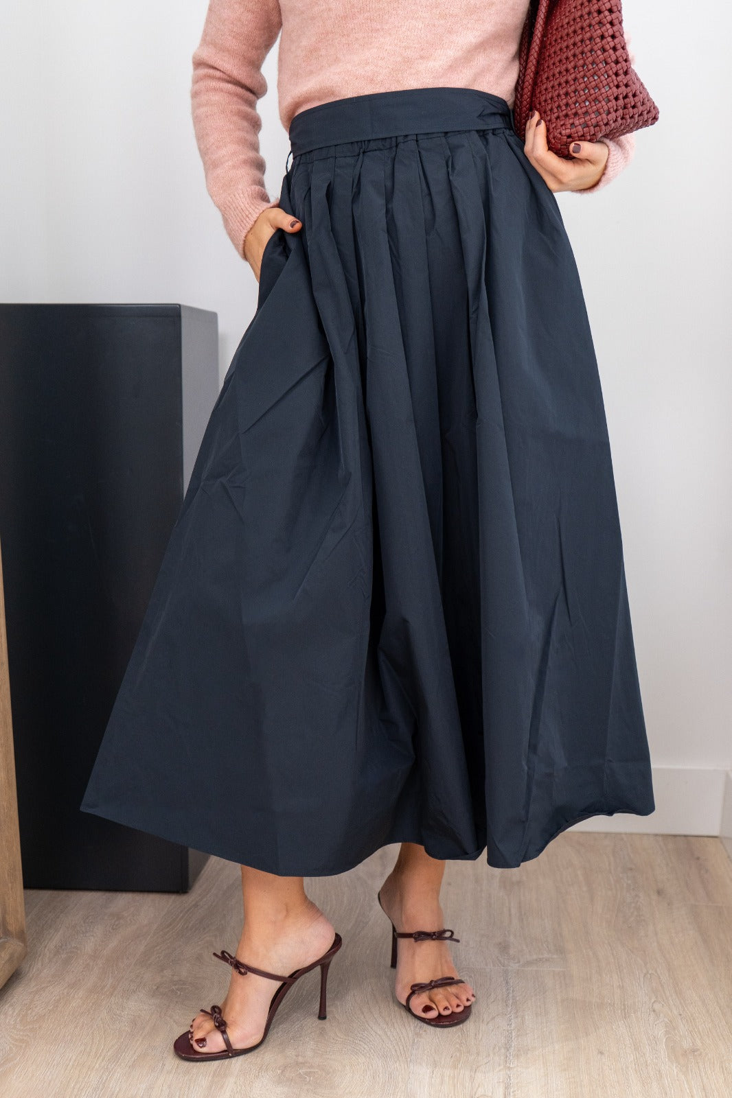 Falda midi, cintura engomada, pinzas delanteras, bolsillos laterales. En tafetán azul.