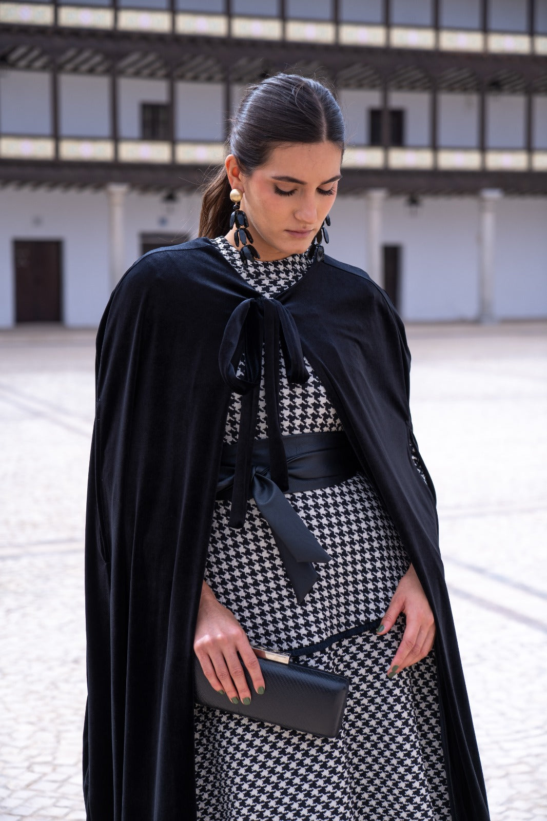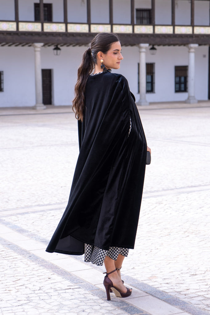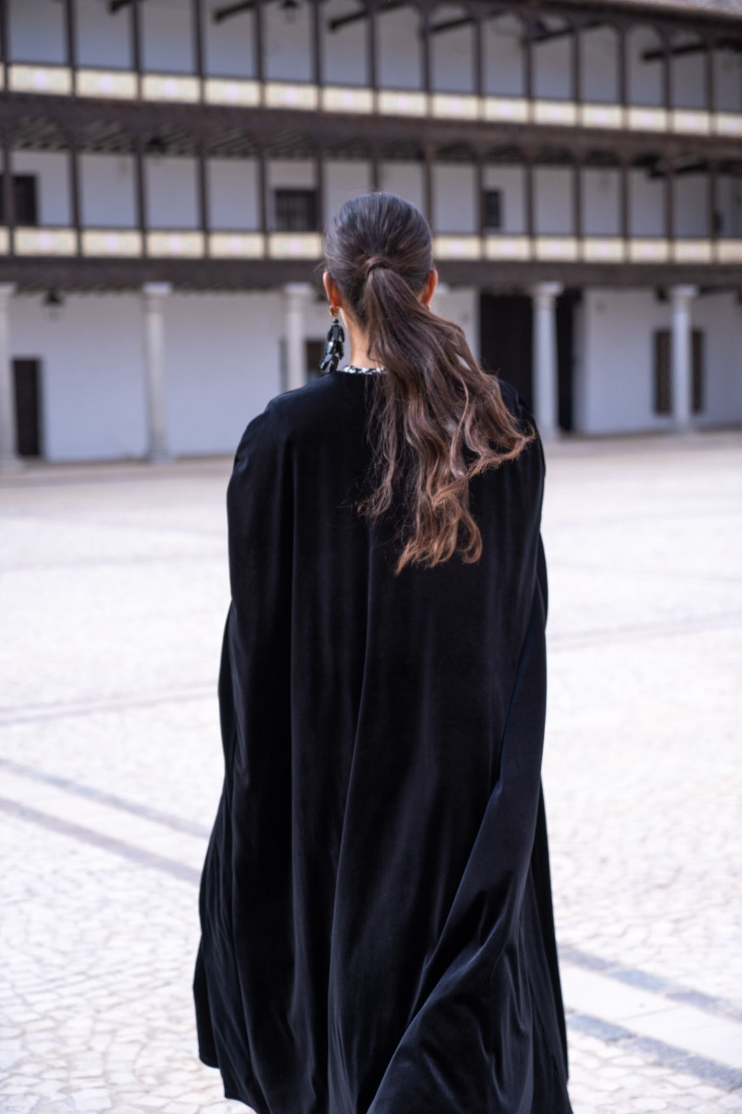 Capa en terciopelo, abertura para meter las manos, 120cm aprox de largo, con lazo para anudar al cuello. En color negro.