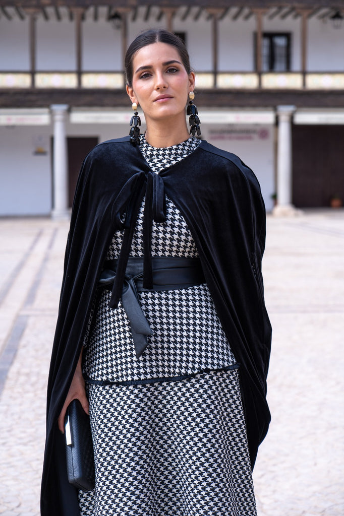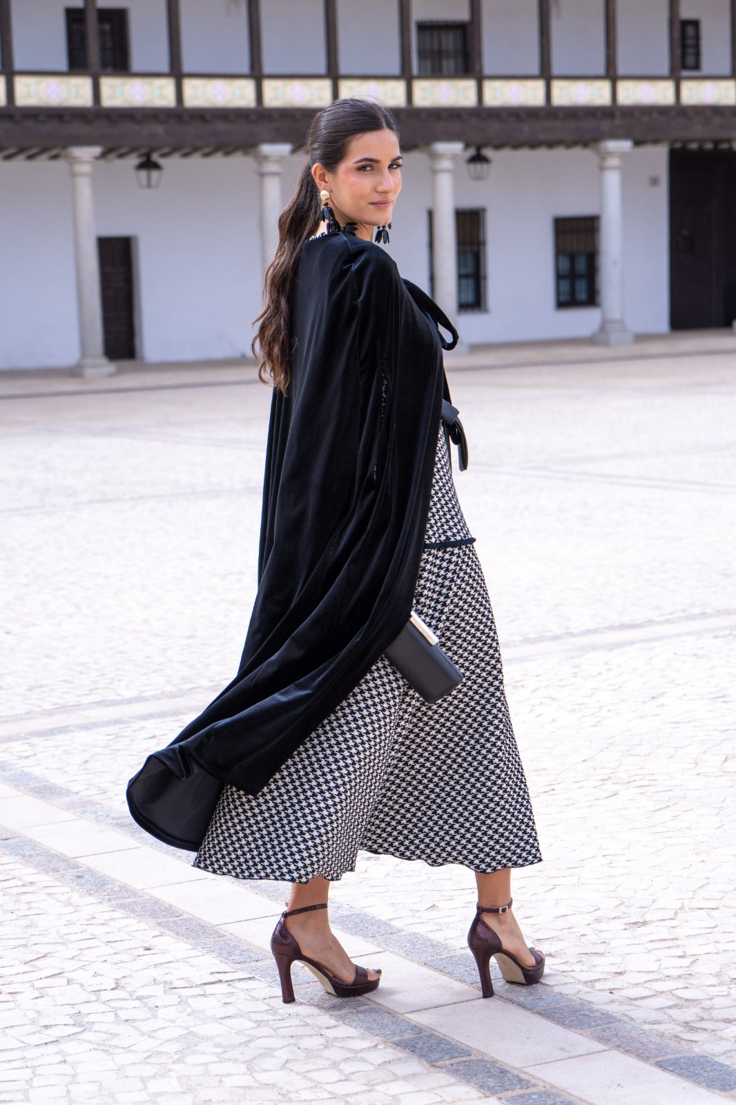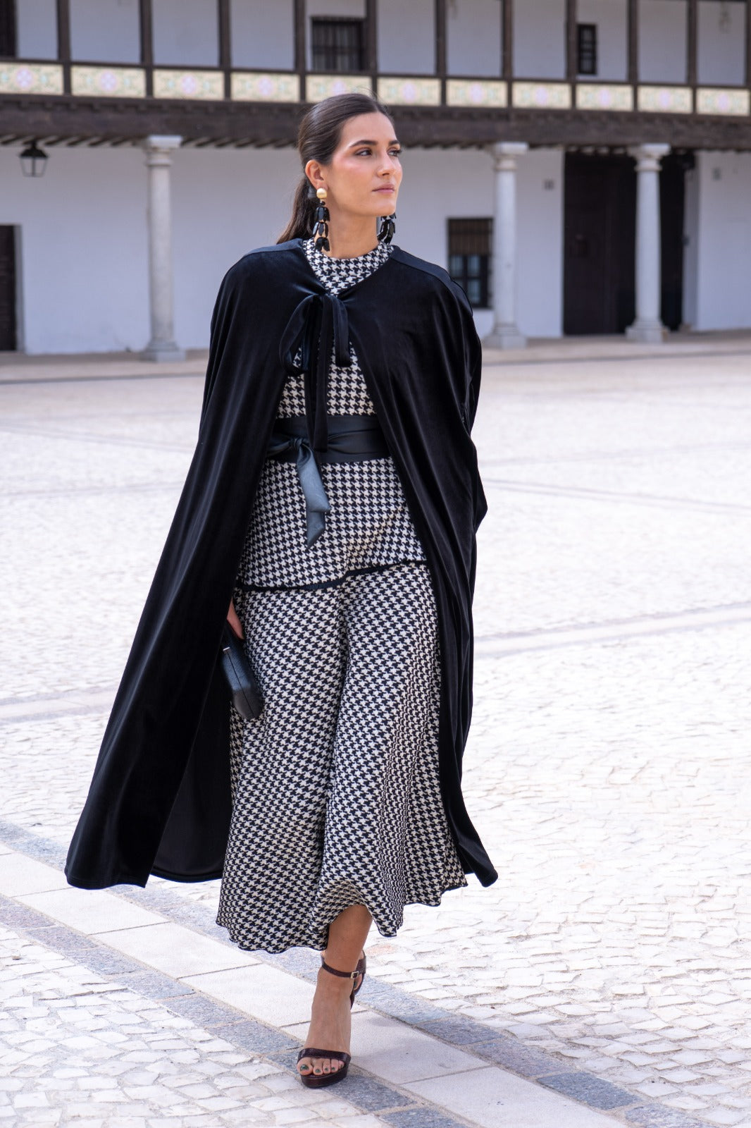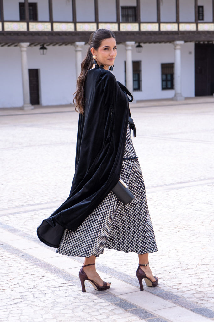 Capa en terciopelo, abertura para meter las manos, 120cm aprox de largo, con lazo para anudar al cuello. En color negro.
