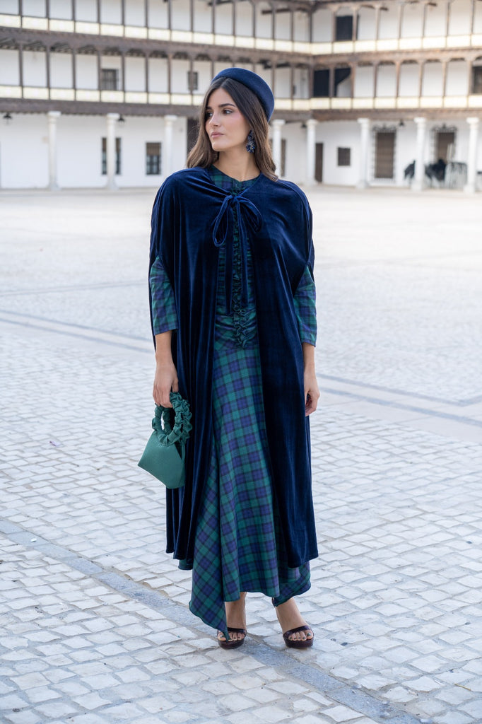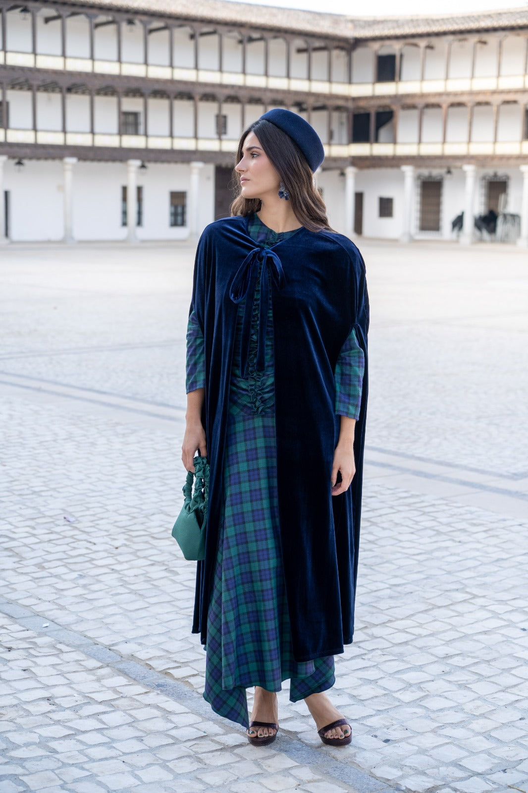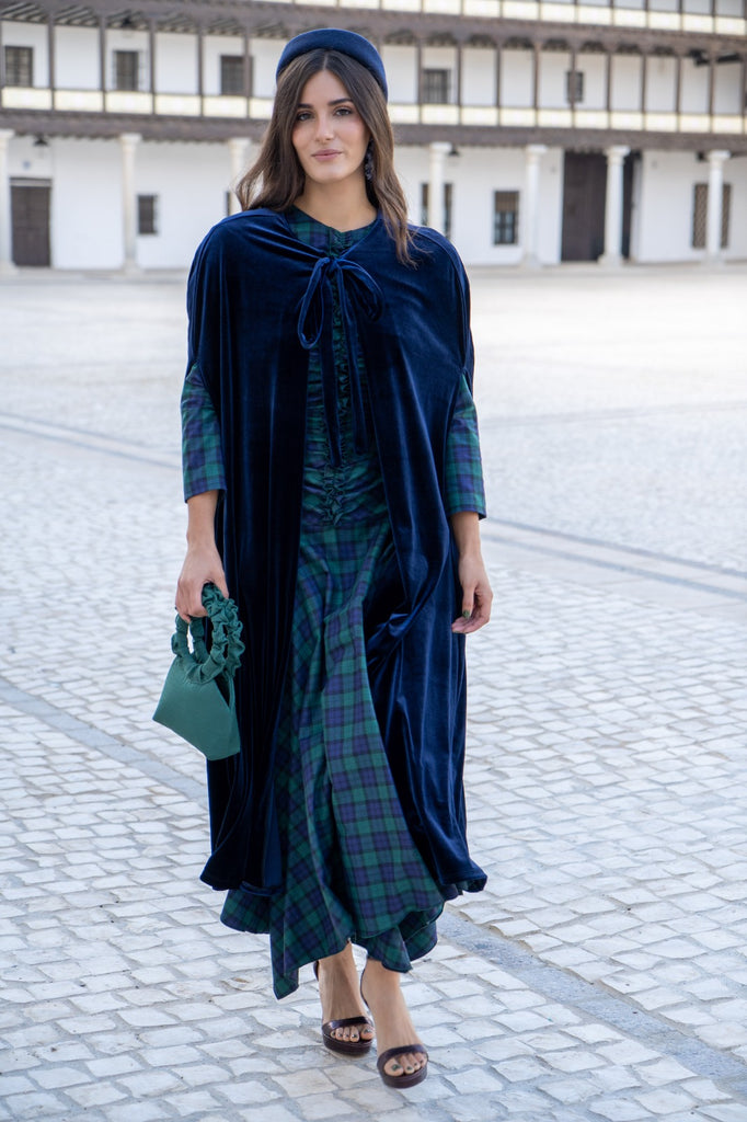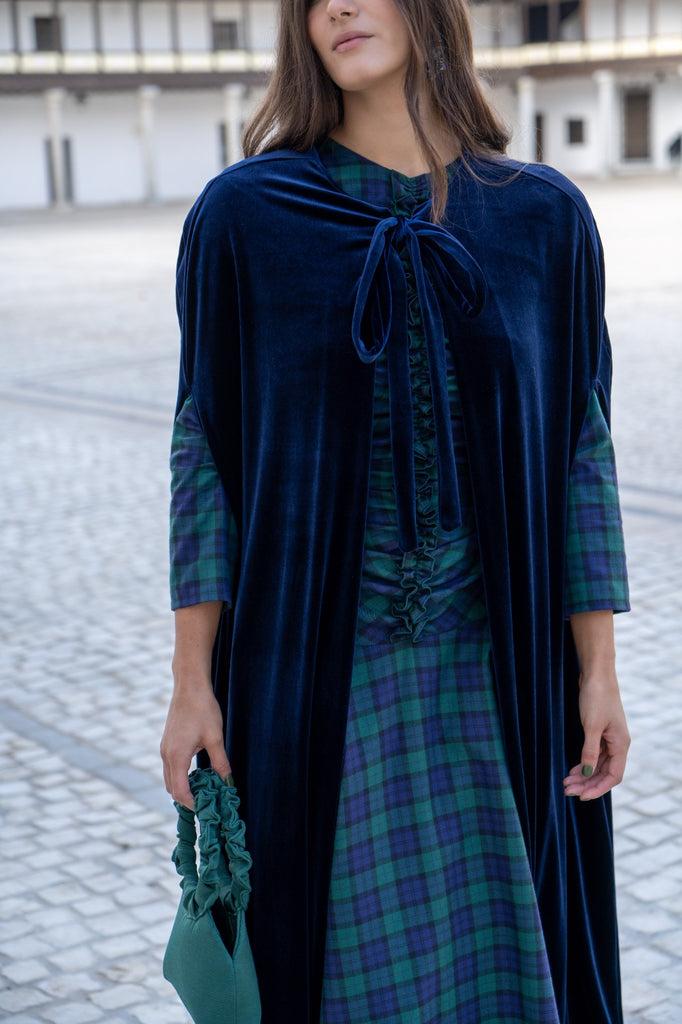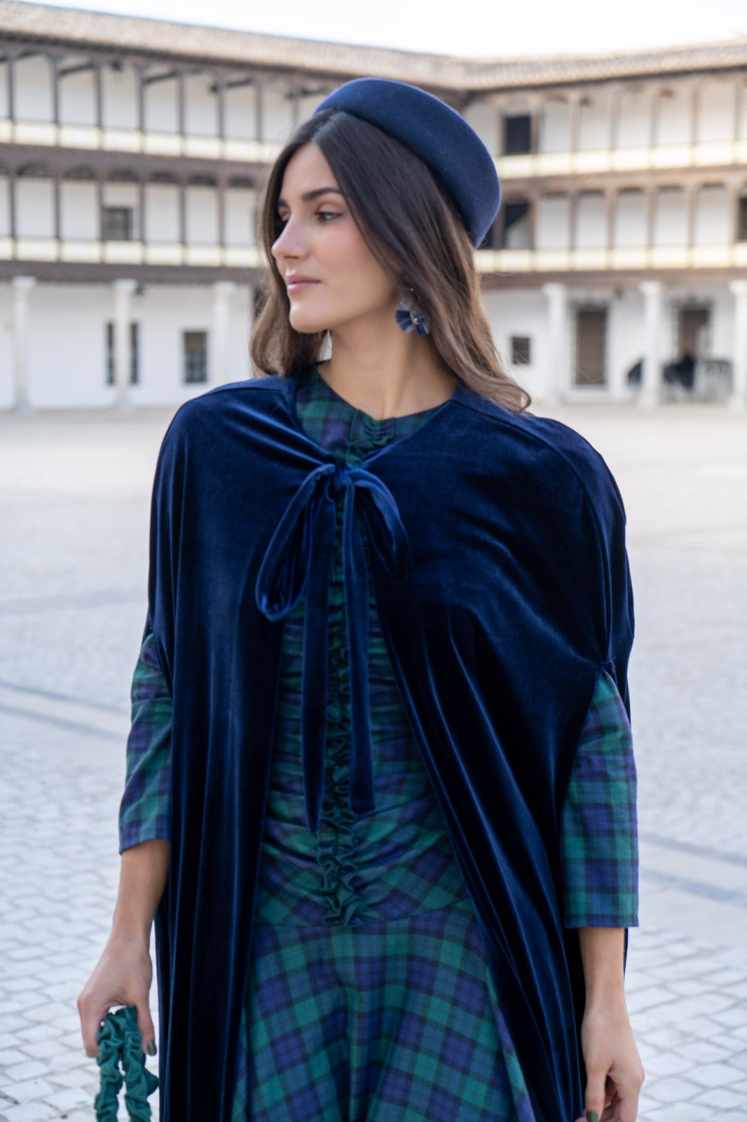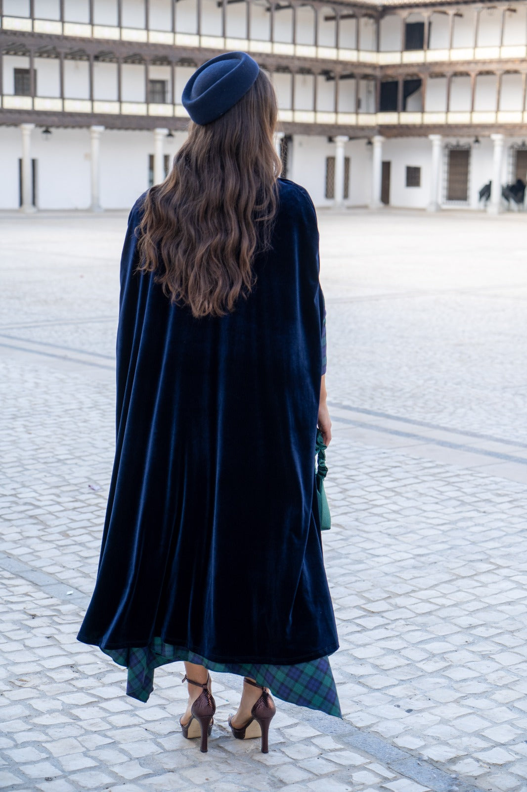 Capa en terciopelo, abertura para meter las manos, 120cm aprox de largo, con lazo para anudar al cuello. En color azul.