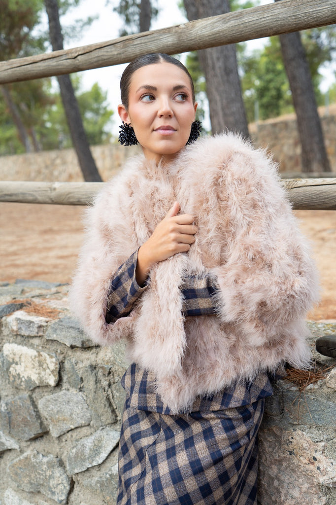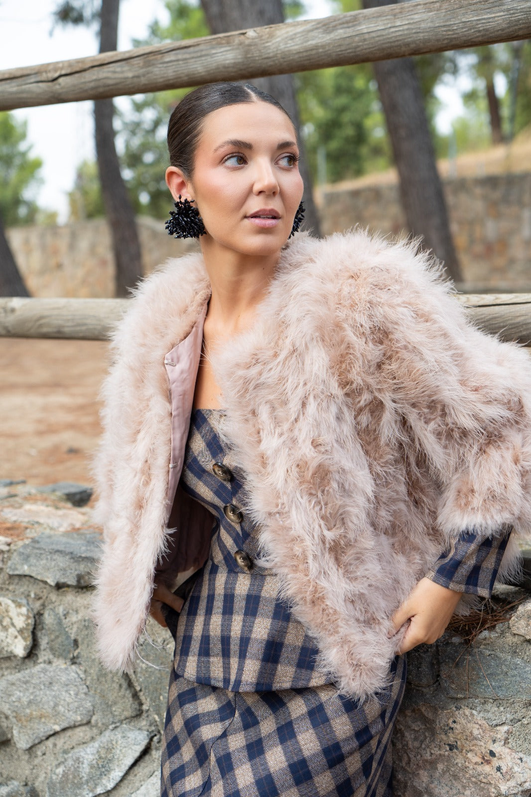 Chaqueta corta, cuello redondo, bolsillos laterales, en marabú color rosa.
