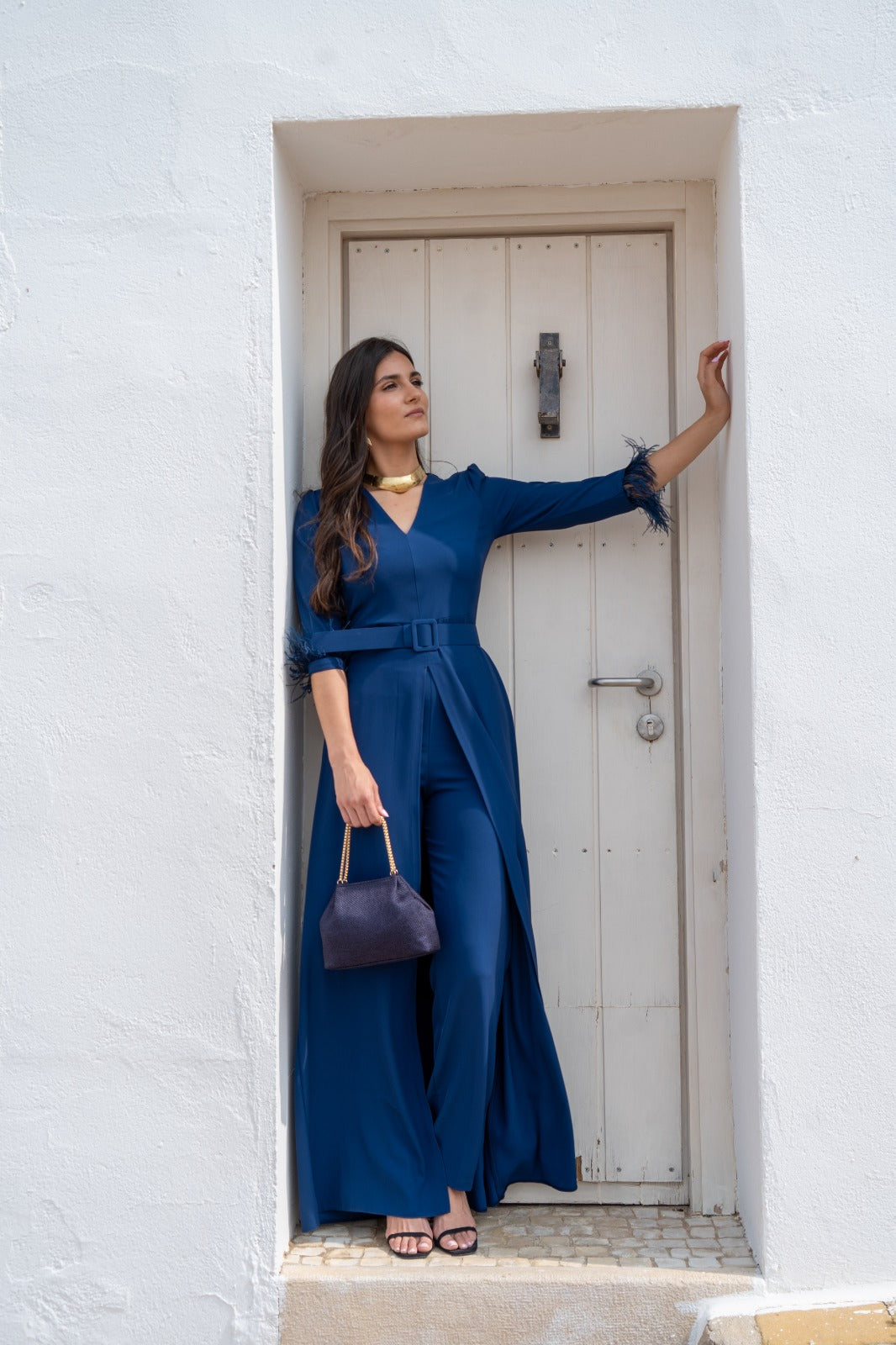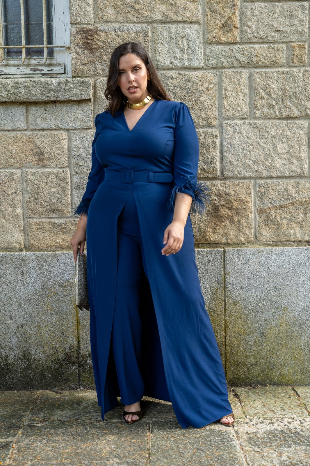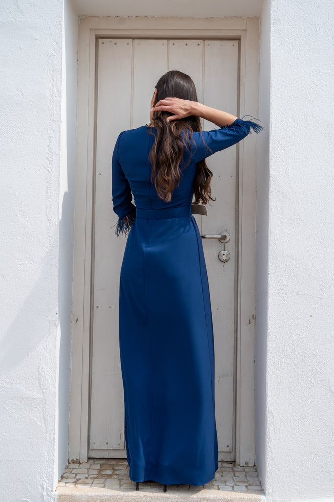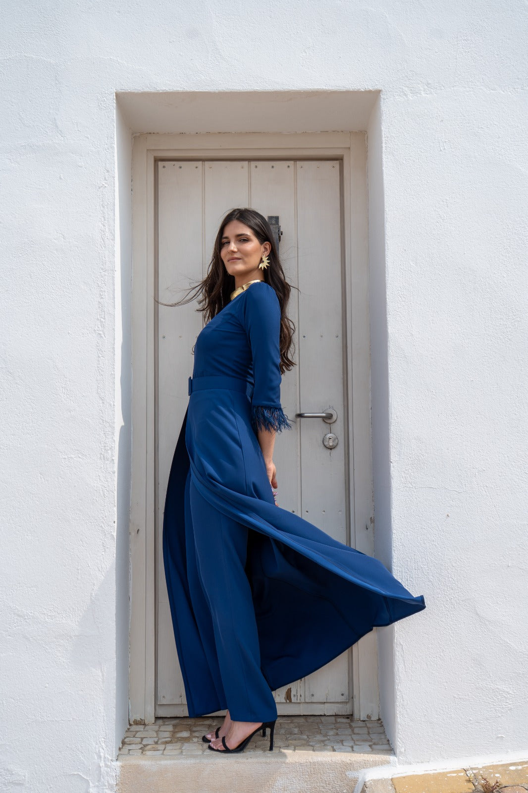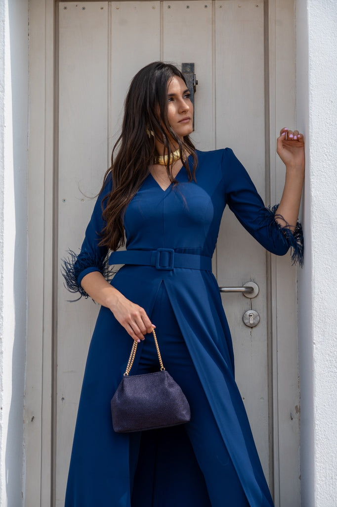 Conjunto compuesto por levita larga, escote a pico, manga francesa con plumas, abertura delantera y pantalón cinturilla, cremallera trasera, estrecho de abajo. En color marino.