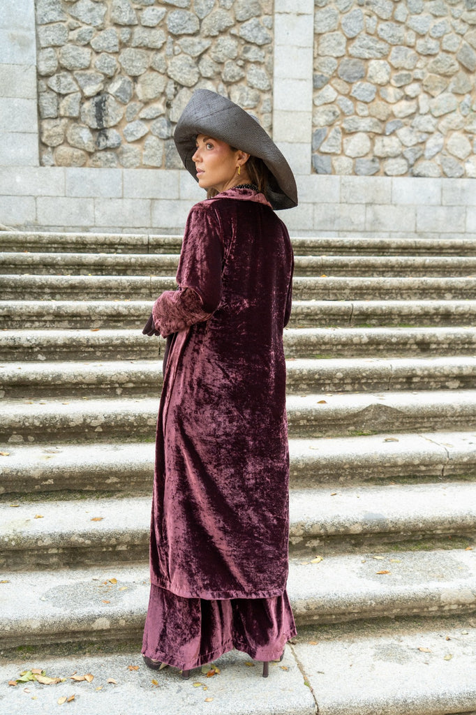 Conjunto formado por kaftan manga larga, abotonado y pantalón cintura engomada, bolsillos laterales. En color burdeos.