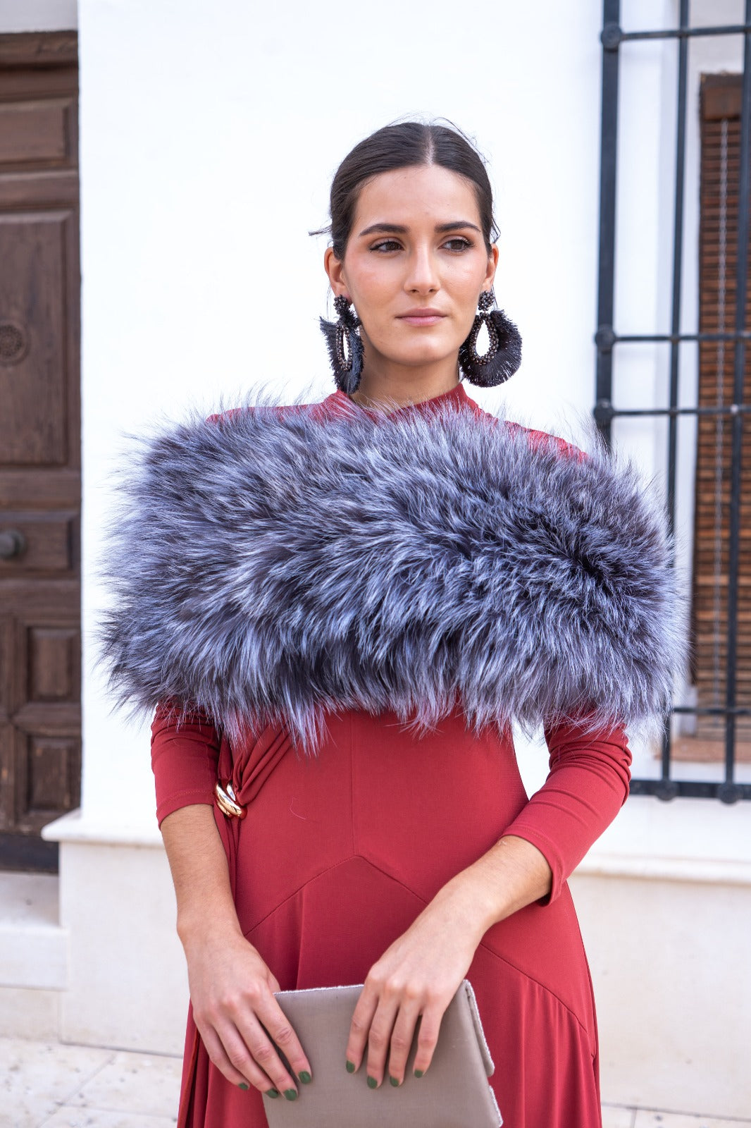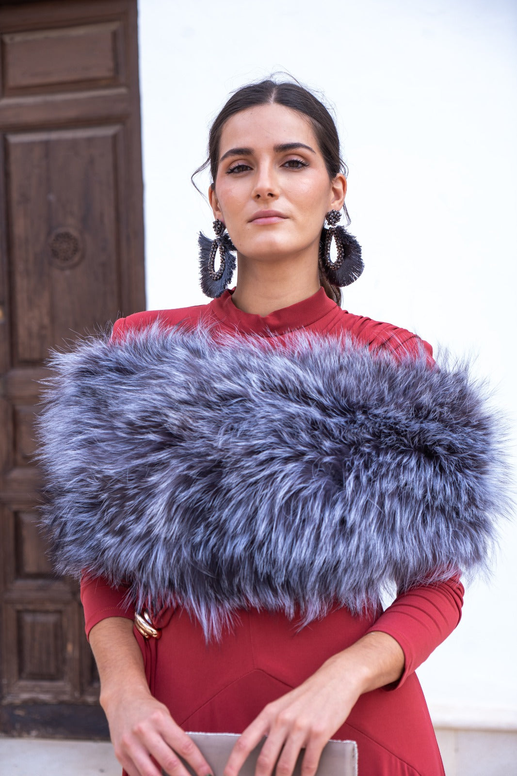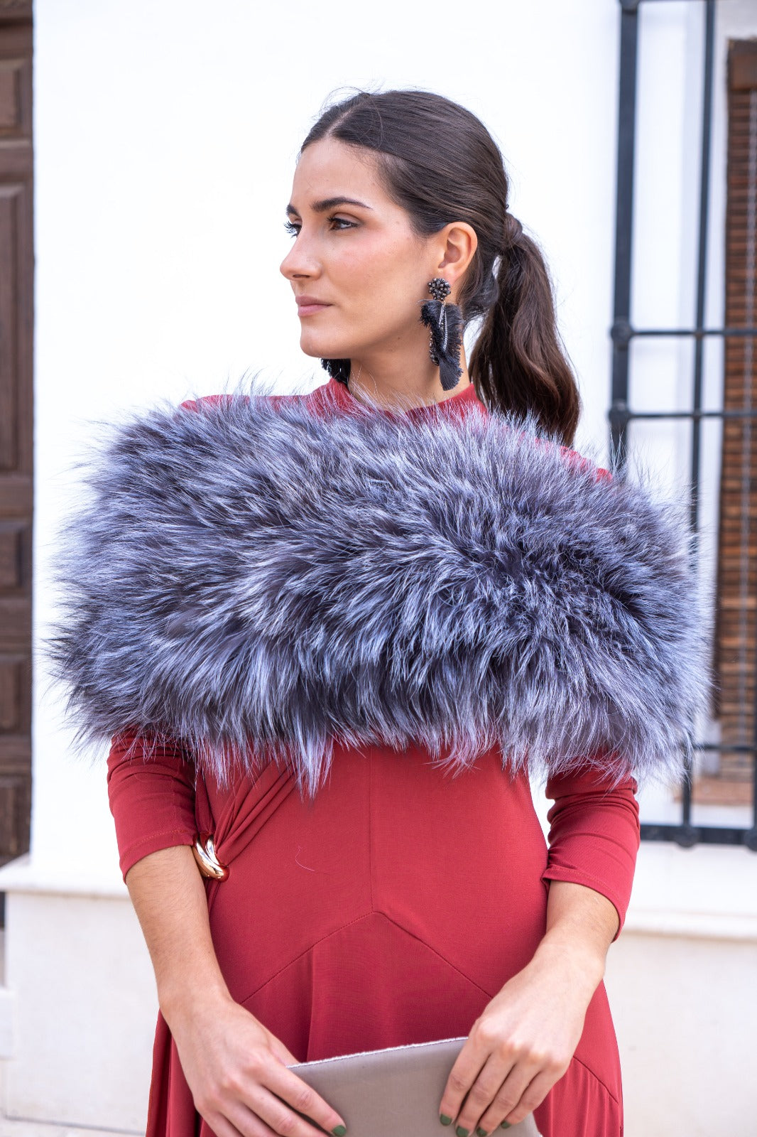 Estola pelo natural, redonda, elástica, para cubrir los brazos. En color gris.