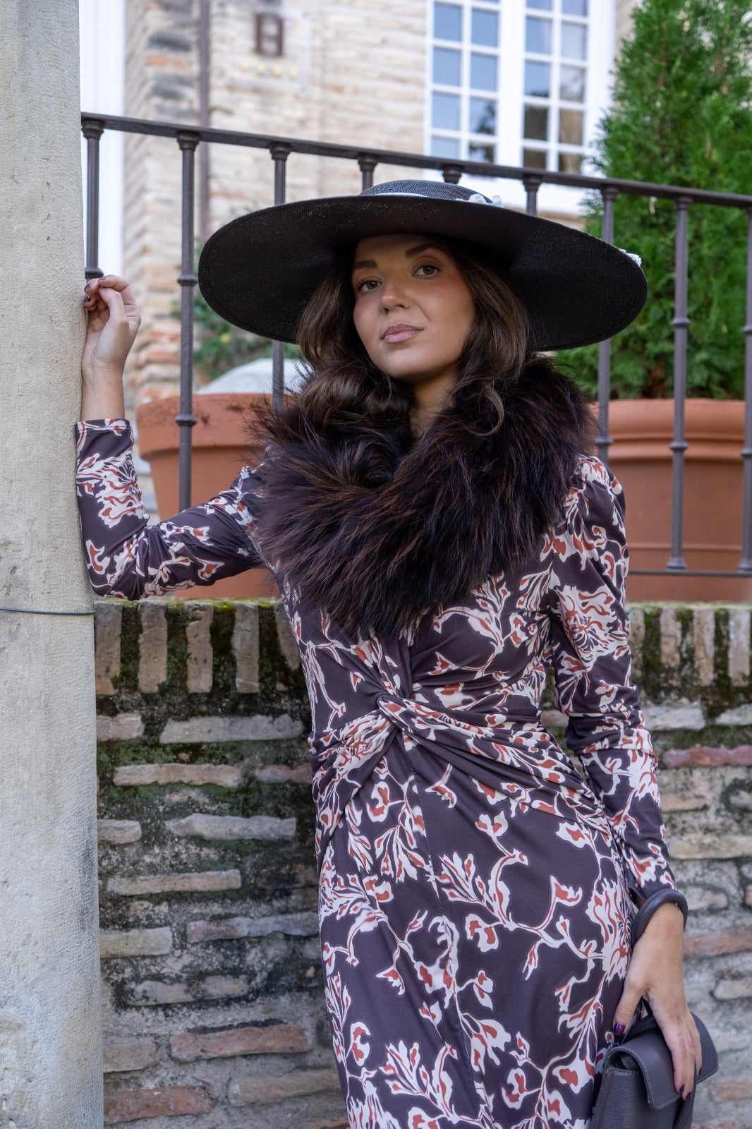 Vestido midi, escote a pico terminado en nudo, corte en cintura, abertura delantera, en color marrón con estampado.