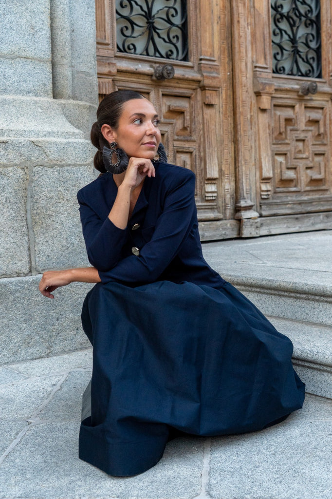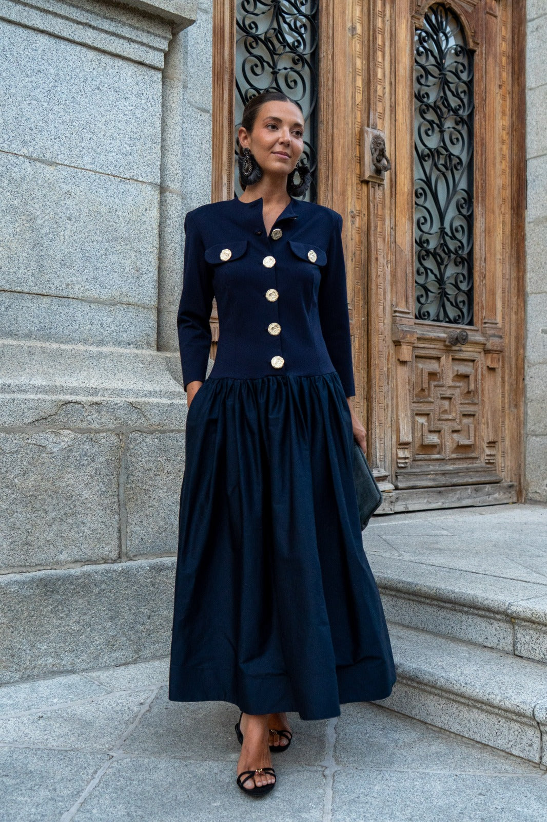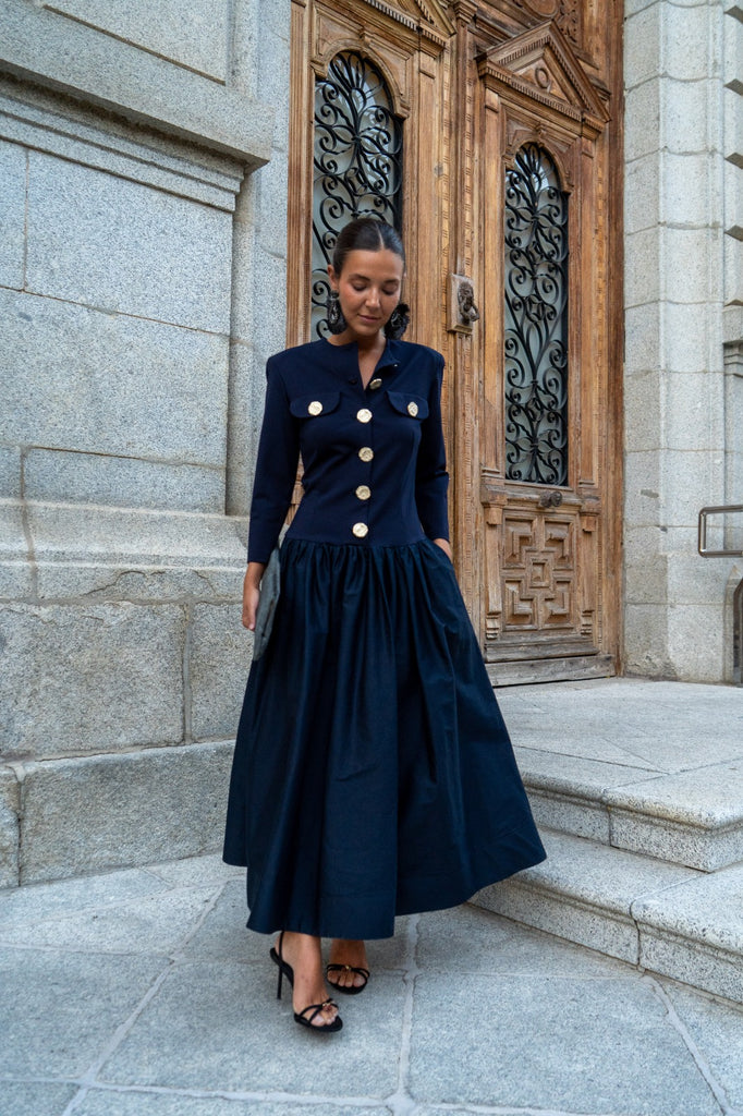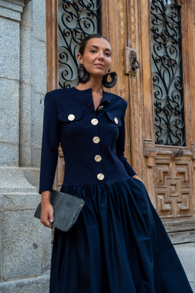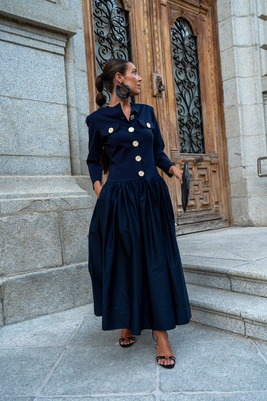 Vestido midi, escote redondo, abotonado, manga francesa, falda con volumen, bolsillos laterales. En color azul.