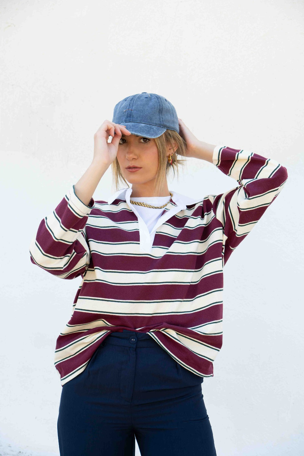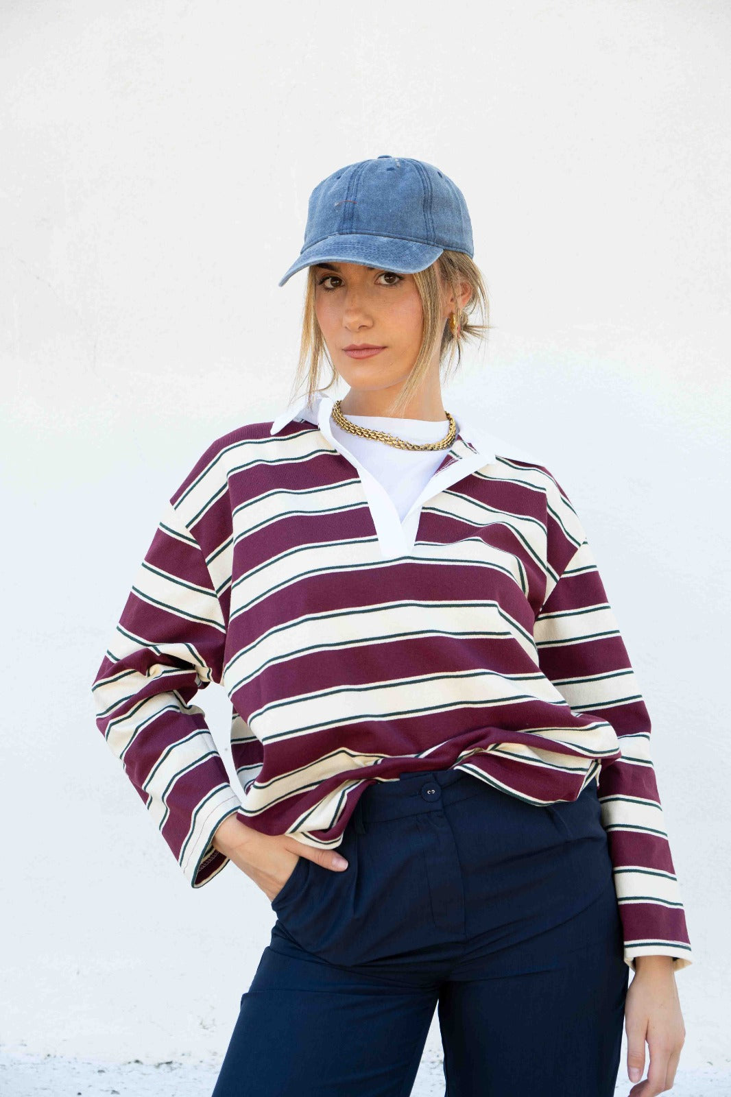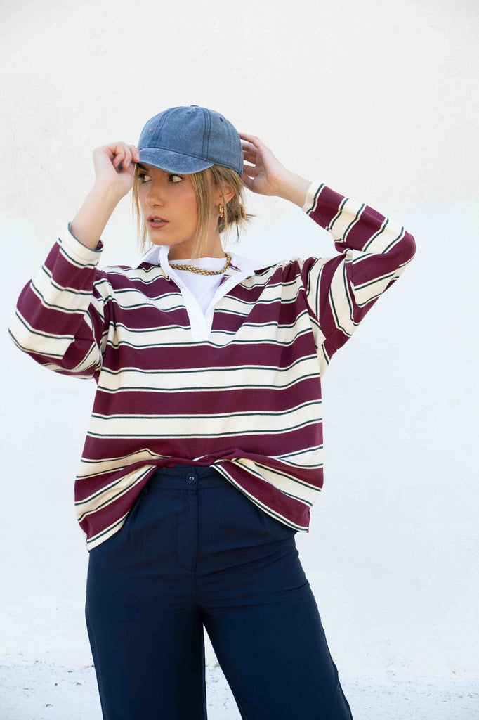 Camiseta con cuello, tipo polo, manga larga, a rayas beiges y burdeos.