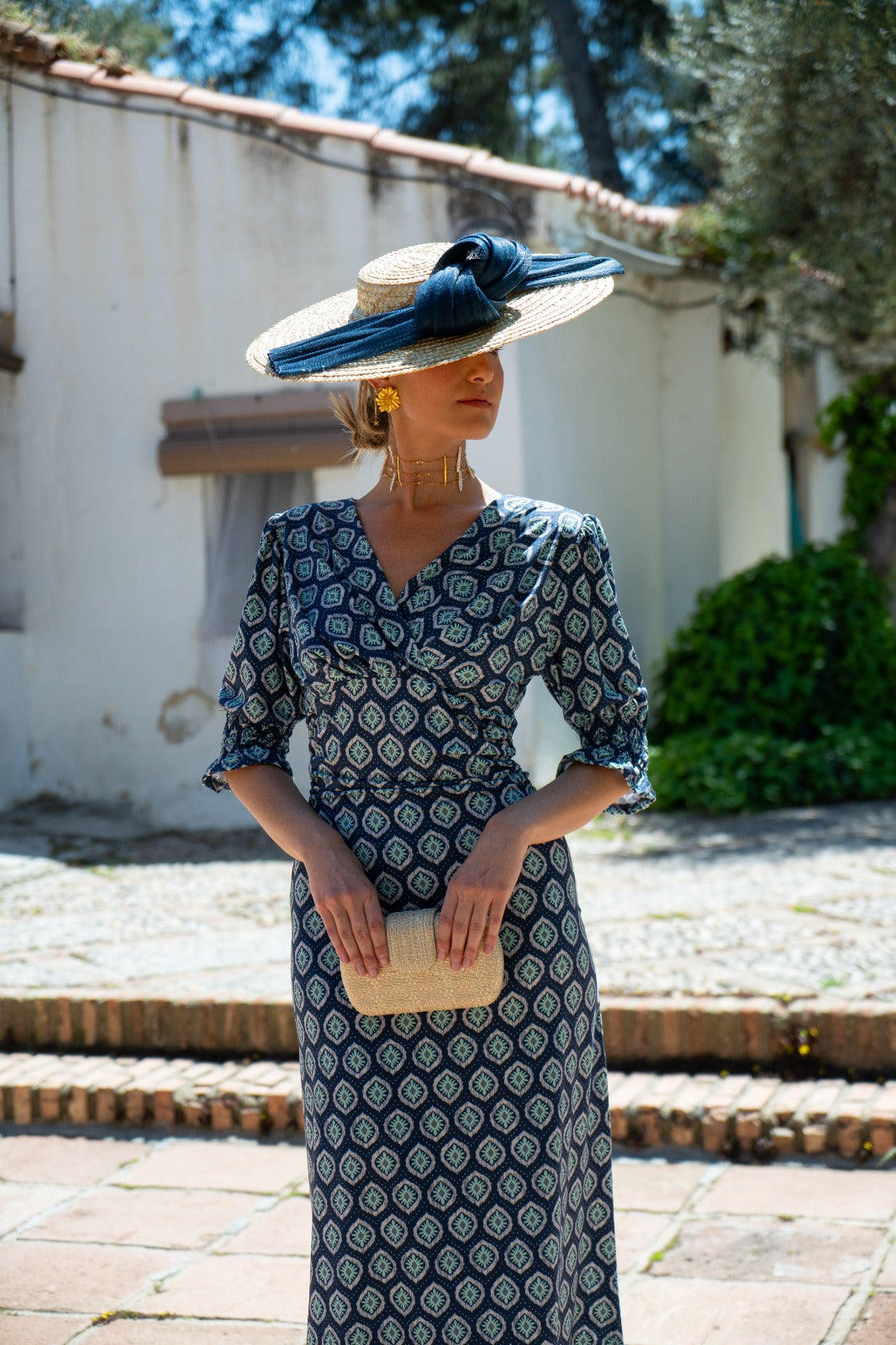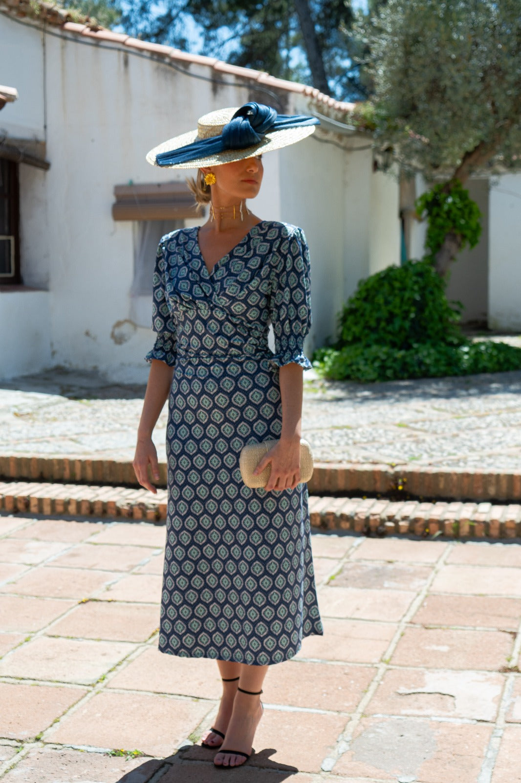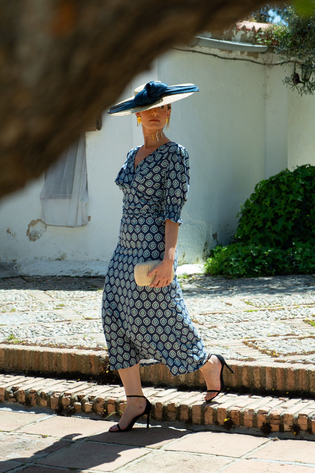 Vestido midi, escote cruzado, manga francesa, corte en cintura, totalmente elastico. En estampado azul.