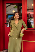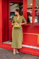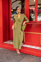 Vestido midi, escote cruzado con solapa, cruzada y abotonada, detalle tapetas bolsillos. En color verde.