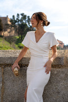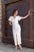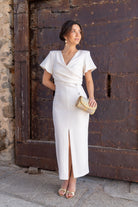 Vestido midi, escote cruzado, manga corta, detalle botones delanteros, abertura delantera. En color beige.