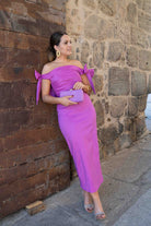 Vestido midi en tafeta elástica con cuerpo drapeado y lazadas que hacen de manga envolviendo los brazos, corte en la cintura con falda recta. En color malva.
