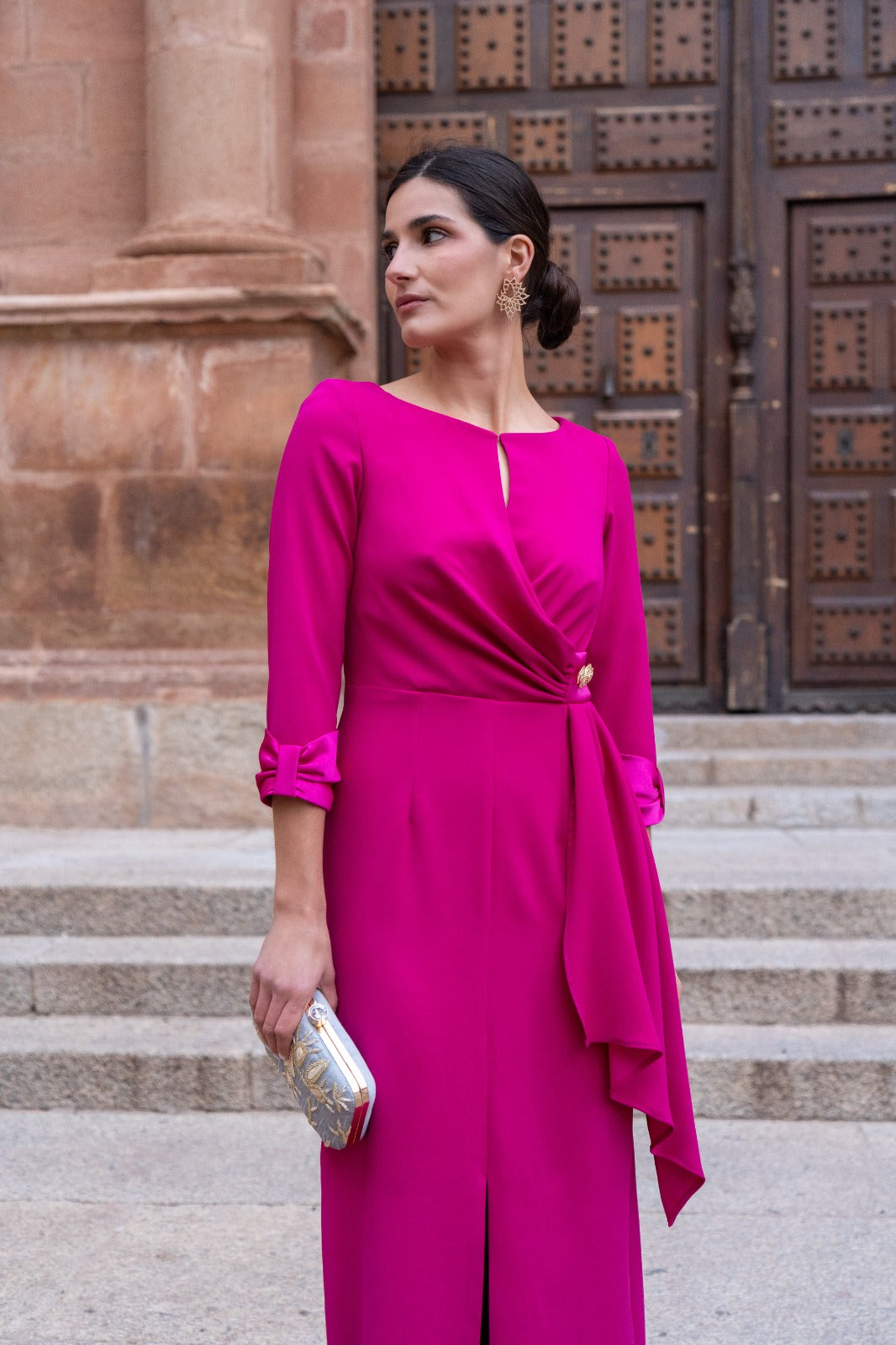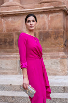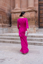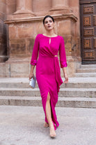 Vestido largo, escote redondo con pequeña abertura, manga francesa con puño en satén, corte en cintura, con caída a un lado. En color fucsia. (Broche de la cintura NO INCLUIDO).
