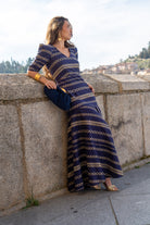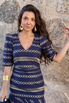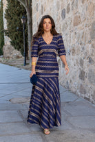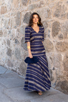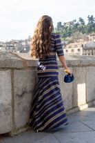 Vestido largo, escote cuadrado, manga corta, entallado hasta la cadera, volante abajo. En color azul con detalle dorado.