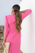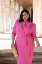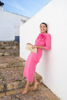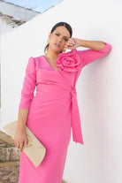 Vestido midi, escote cruzado, manga francesa, detalle flor quita y pon, lazo en cintura a un lado, abertura trasera. En color rosa.