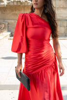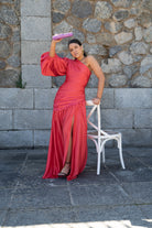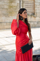 Vestido largo, asimetrico en un lado y manga farol en otro, drapeado, volante abajo. En saten rojo.