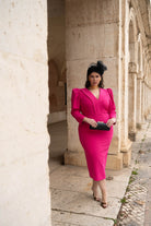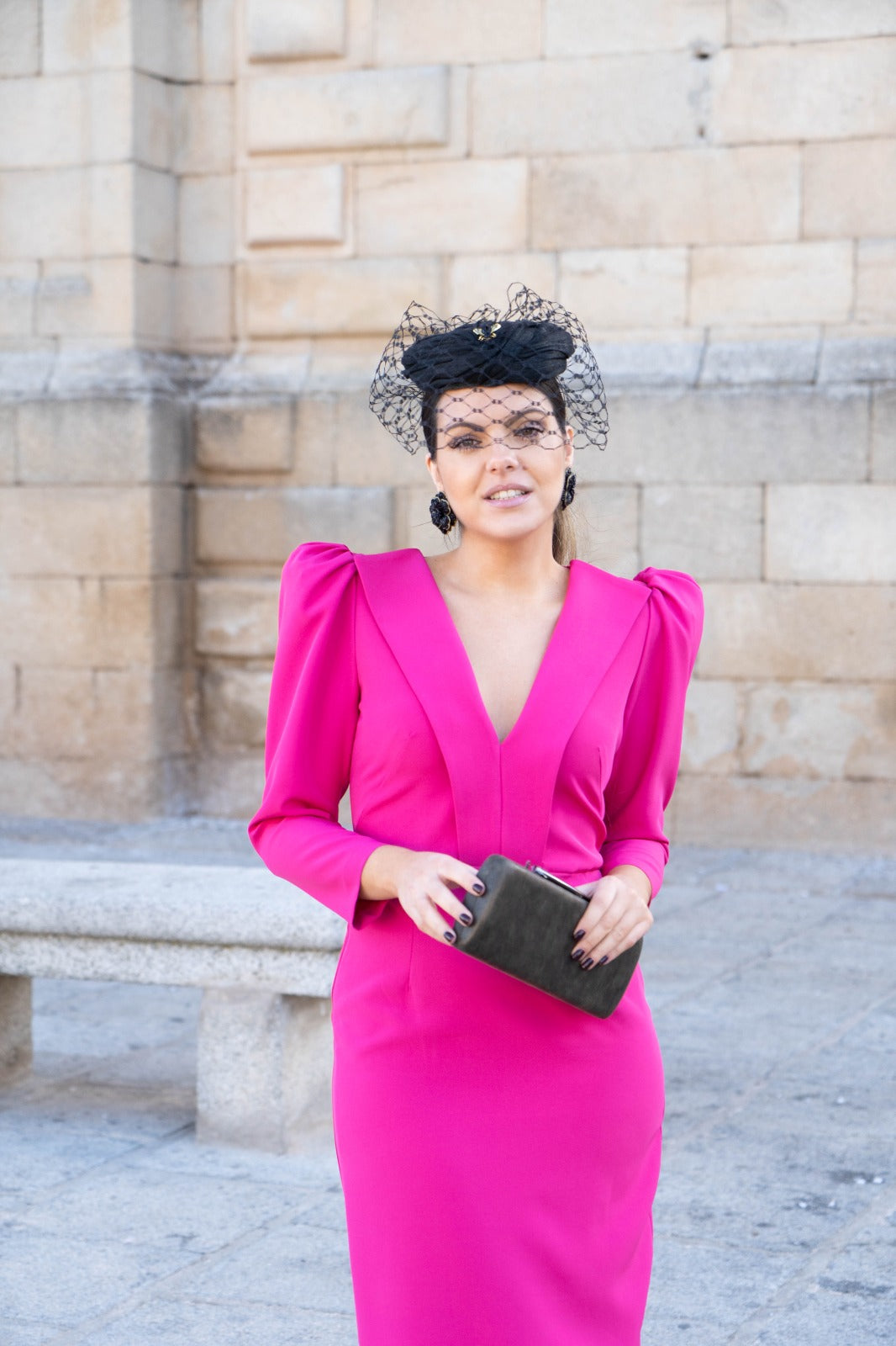 Vestido midi, escote a pico con cuello solapa, manga abullonada, abertura trasera. En color rosa.