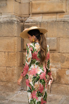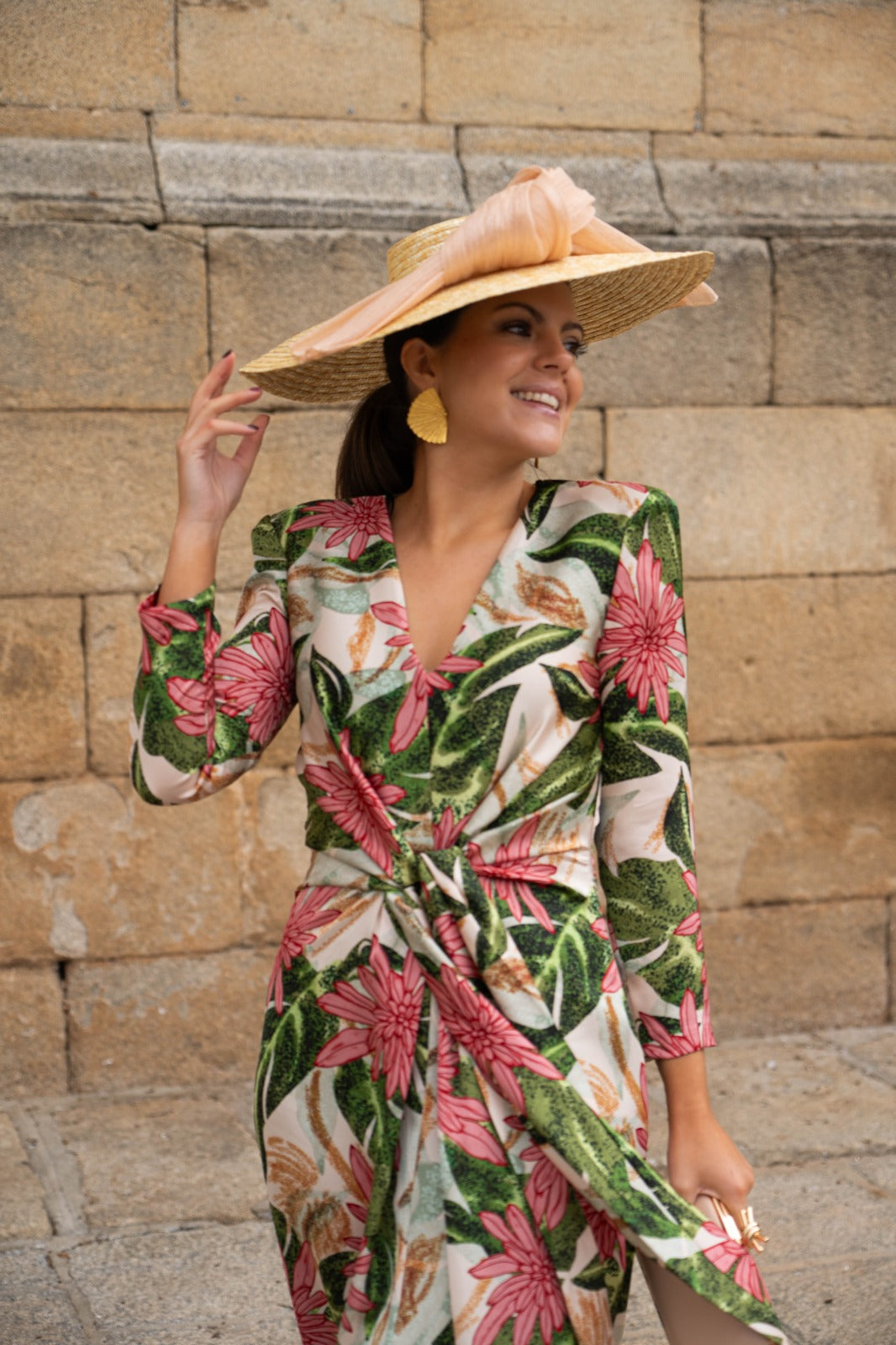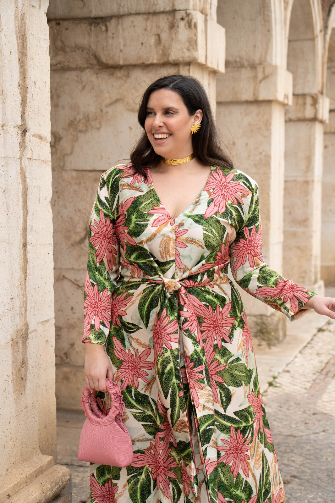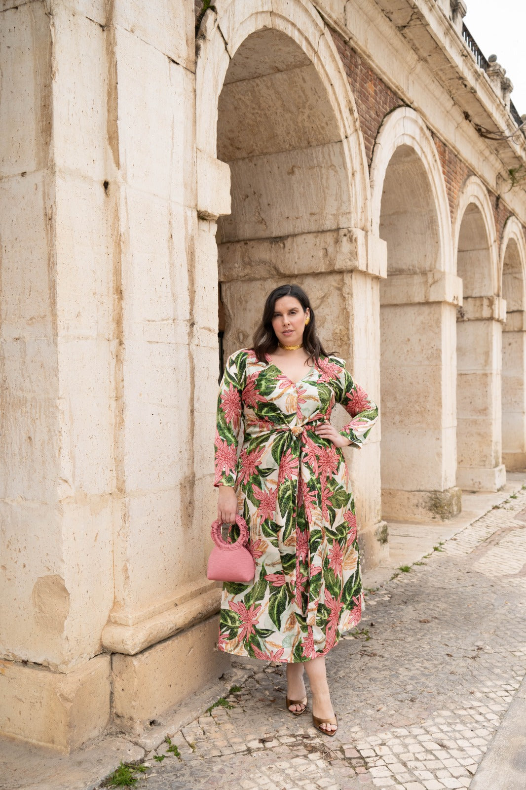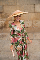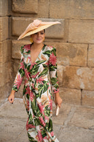 Vestido midi, escote cruzado, manga francesa, lazos para anudar delante en cintura, fluido. En color beige con estampado floral verde y rosa.