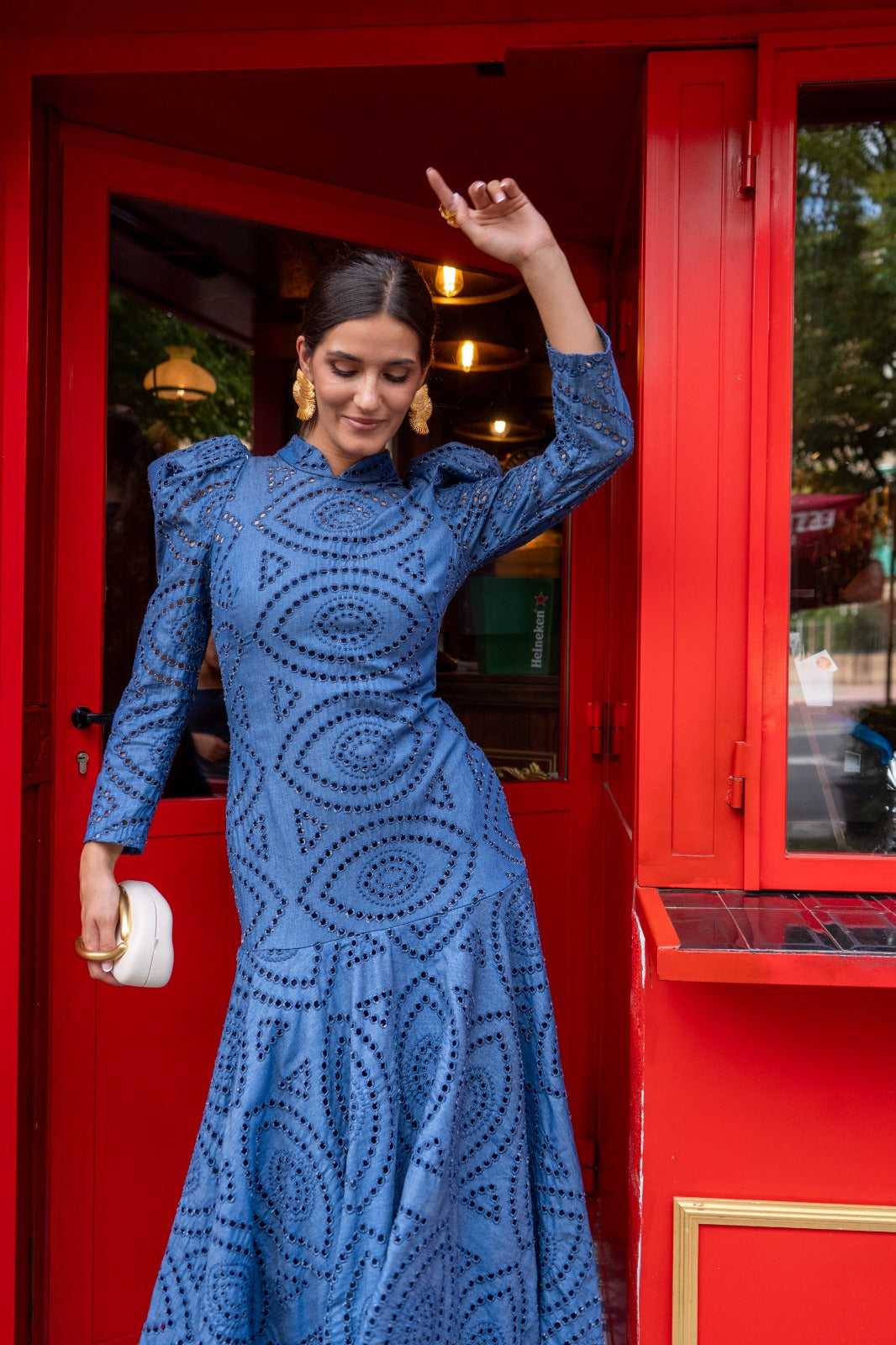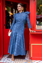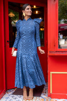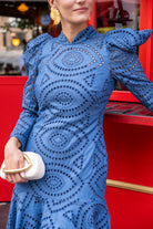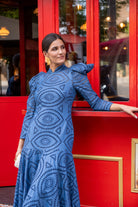 Vestido maxi midi, cuello subido, manga larga, con volante abajo. En color azul, tejido calado.