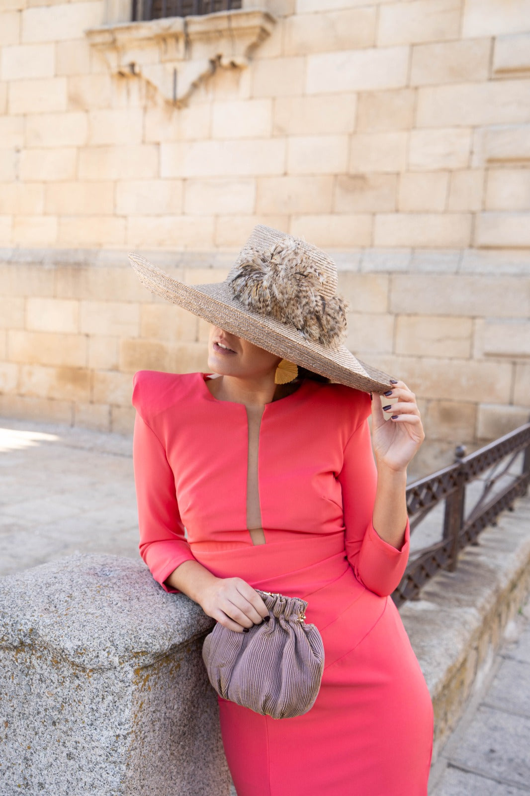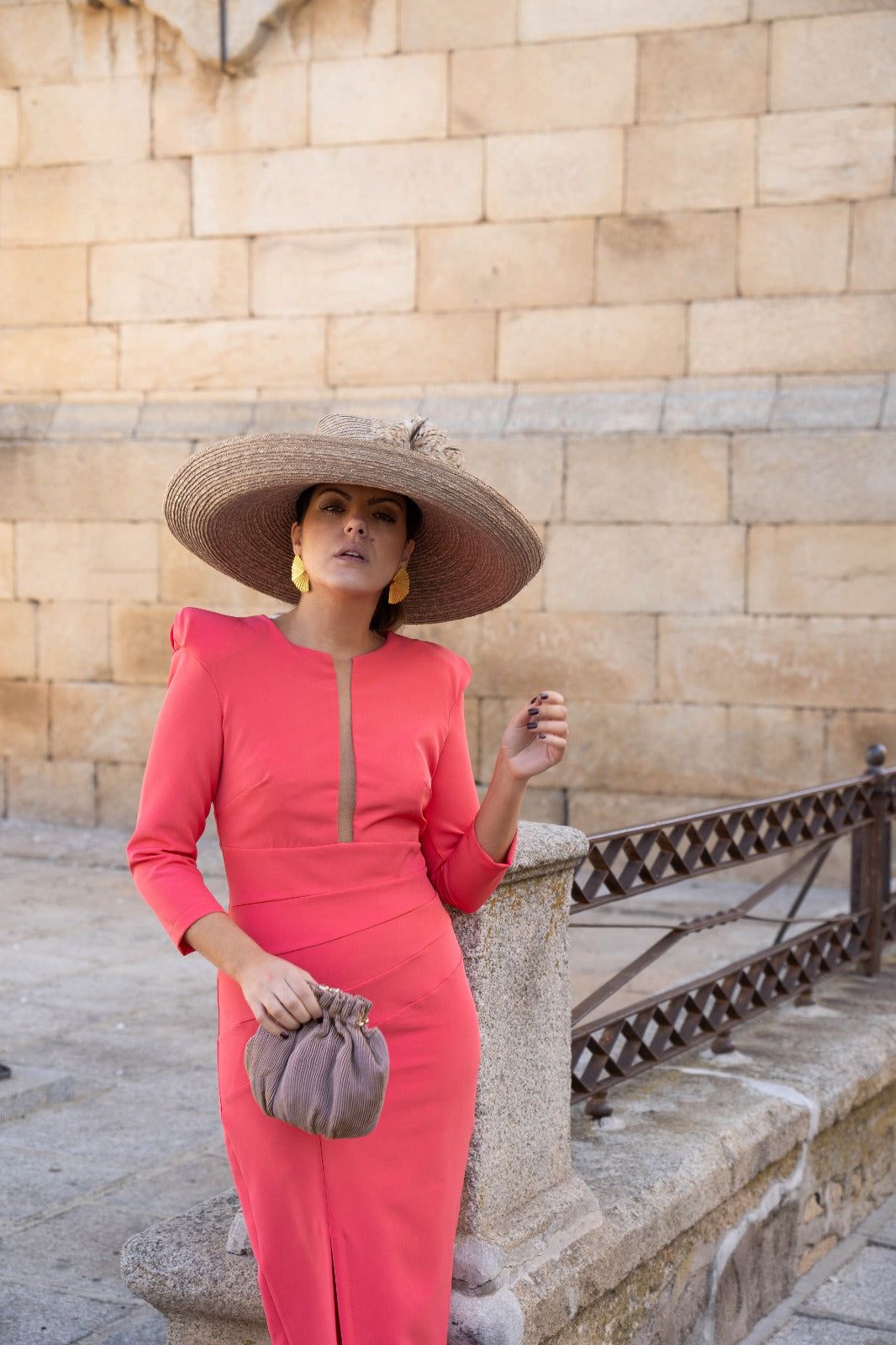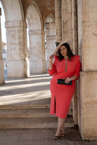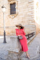 Vestido midi, escote redondo con tira transparente, manga francesa abullonada en hombro, abertura delantera a un lado. En color coral.