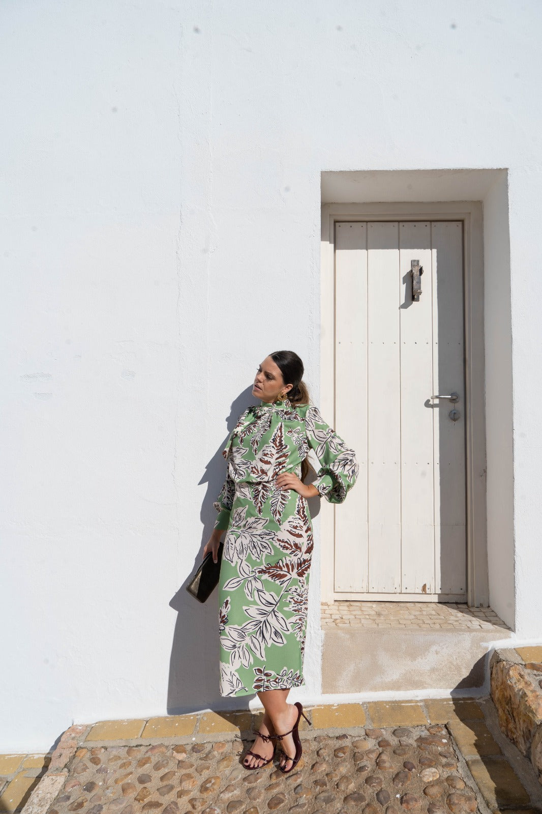 Vestido midi, cuello halter con nudo en un lado, manga larga con goma en el puño, abertura trasera. En color verde con estampado.