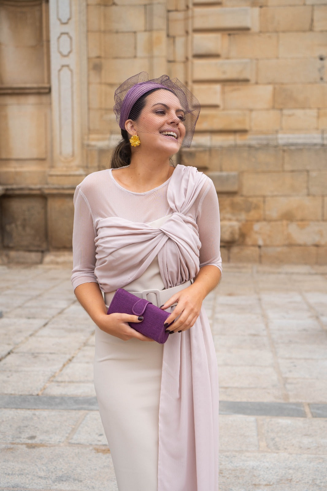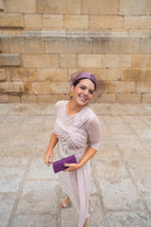 Vestido midi, escote redondo, manga francesa, parte de arriba en gasa con lazo largo en un lado, cinturon incluido, abertura trasera. En color beige.