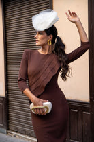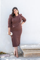 Vestido midi, escote redondo, manga larga, volante en el pecho a un lado, abertura delantera. En color marrón.