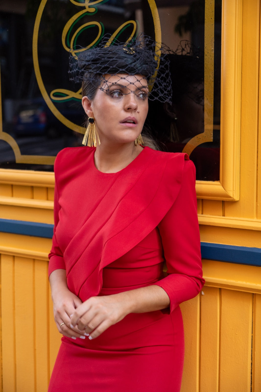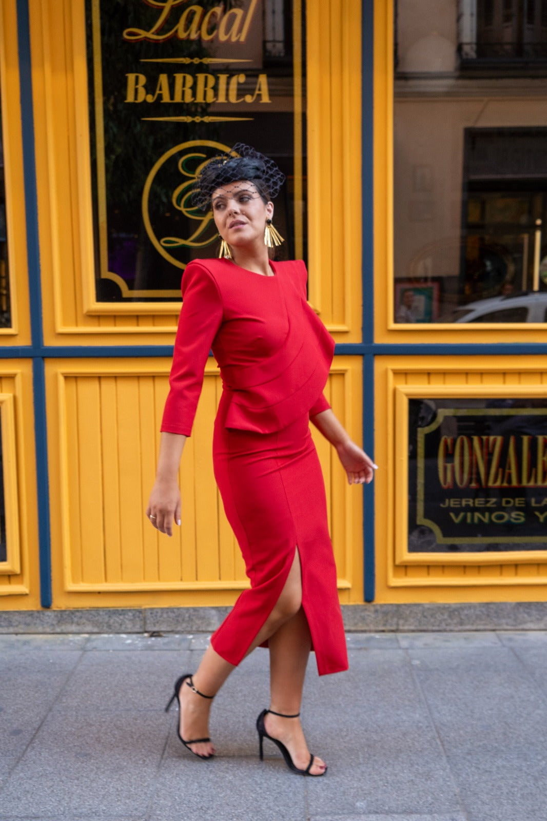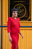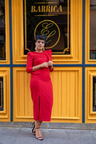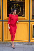 Vestido midi, escote redondo, manga larga, volante en el pecho a un lado, abertura delantera. En color rojo.