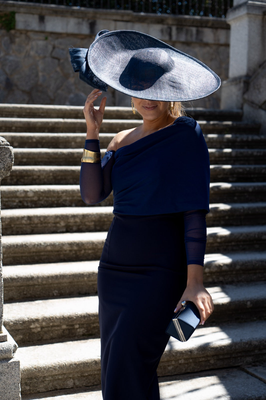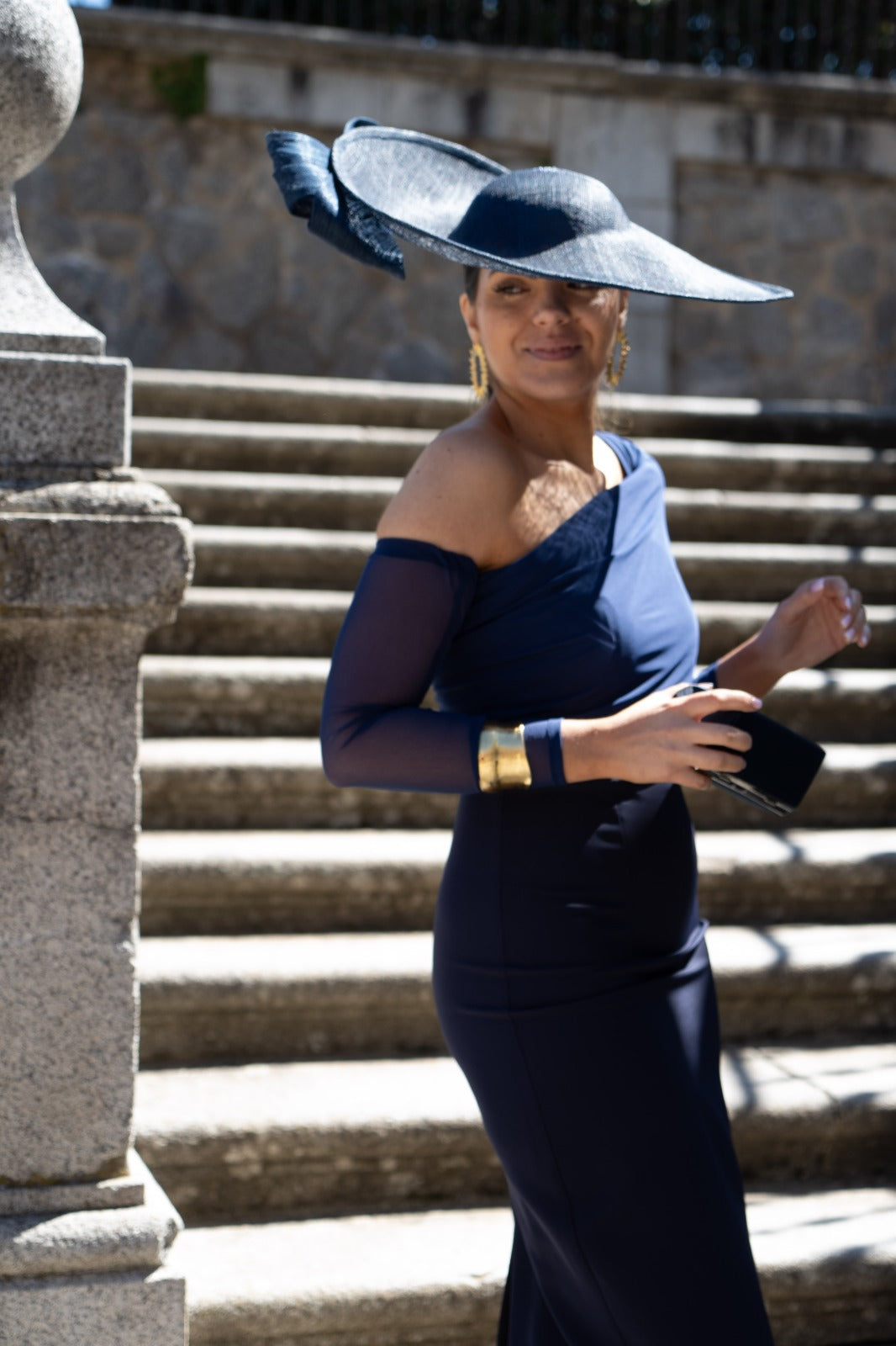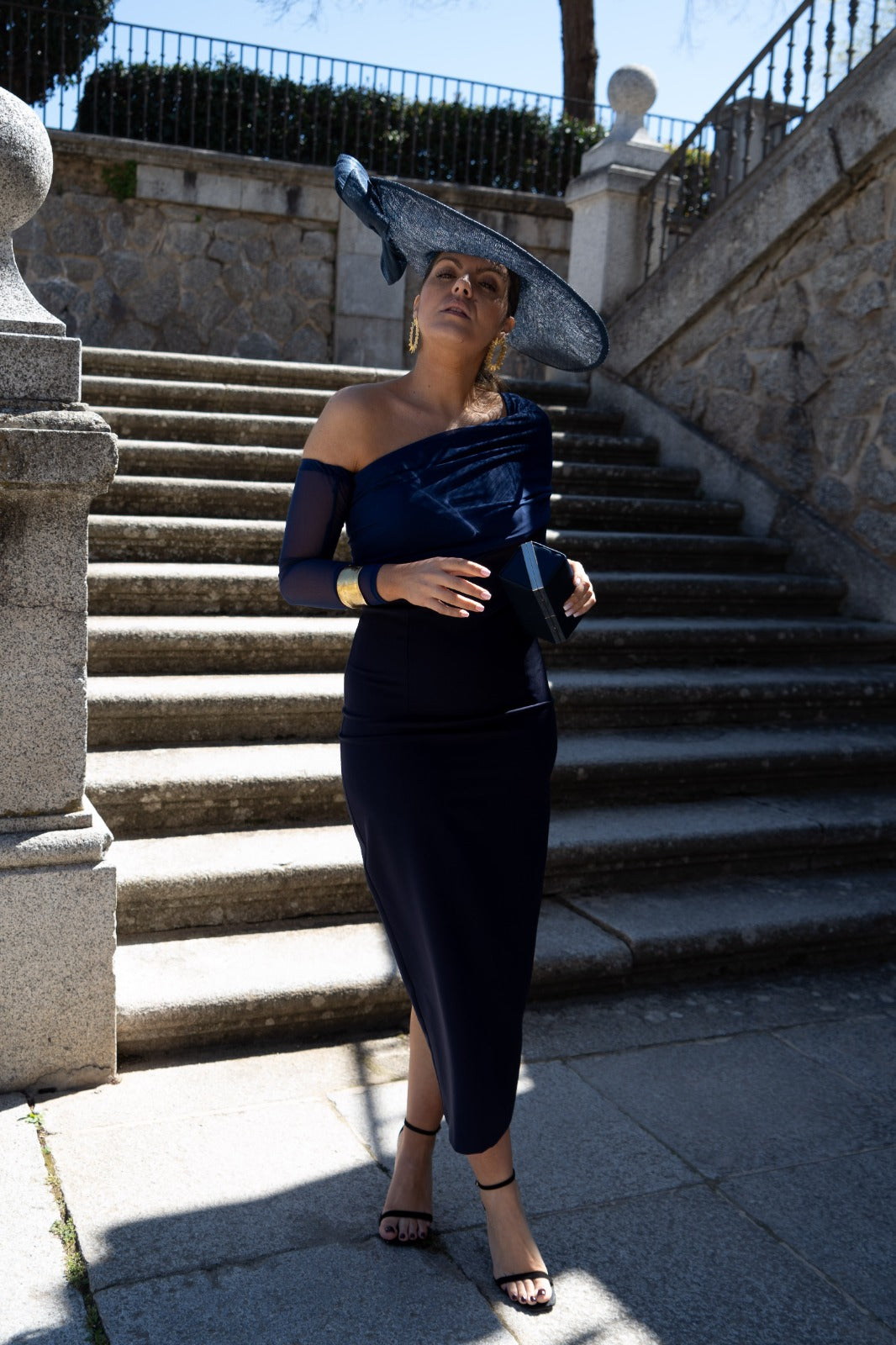 Vestido midi, escote bardot, asimetrico, manguitos para brazo en gasa, abertura trasera. En color azul.