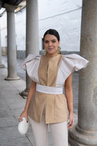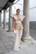 Conjunto compuesto por chaleco en tafetan, escote redondo, mangas pronunciadas, fajin en cintura y pantalon en gasa, tiro alto, cremallera trasera. Bicolor beige.