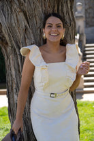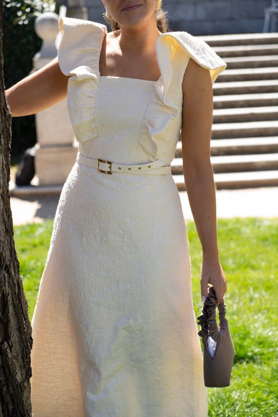 Vestido midi, escote cuadrado y volantes estructurados en los hombros. En color beige con estampado floral en relieve.