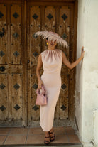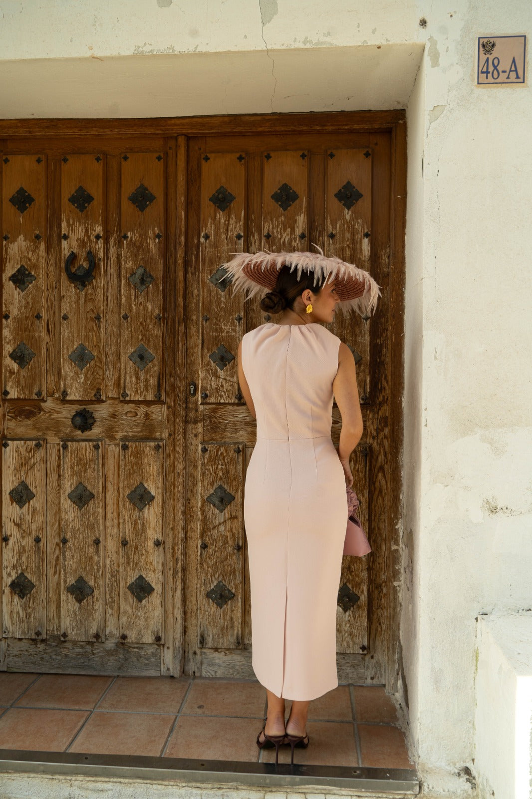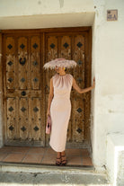 Vestido midi, cuello fruncido, sin mangas, abertura trasera. En pique color rosa.