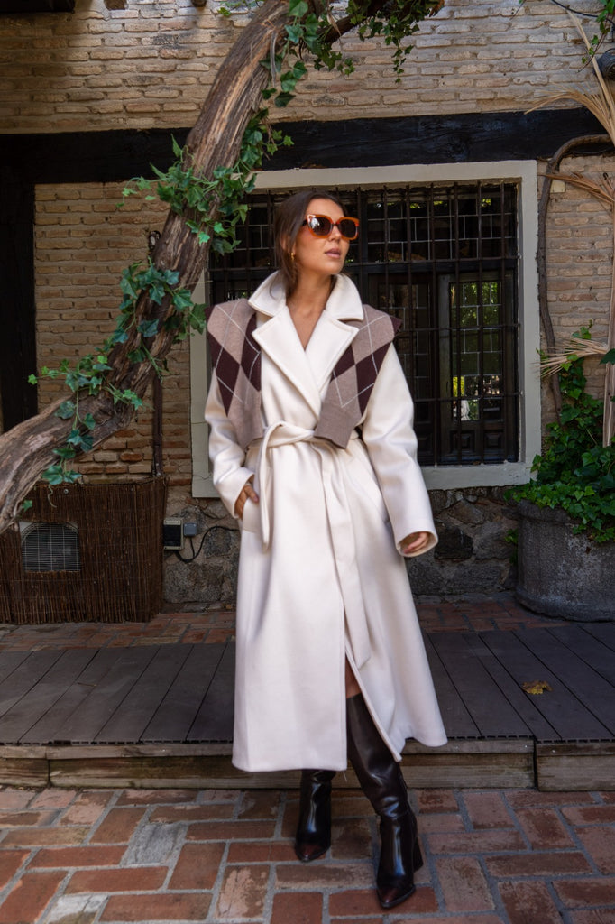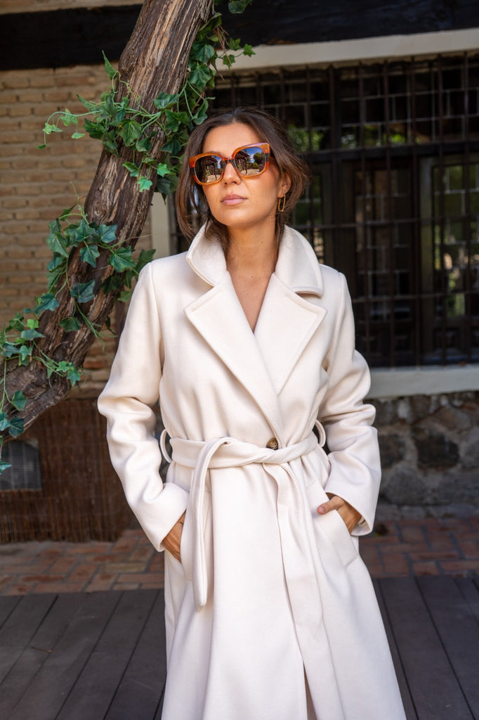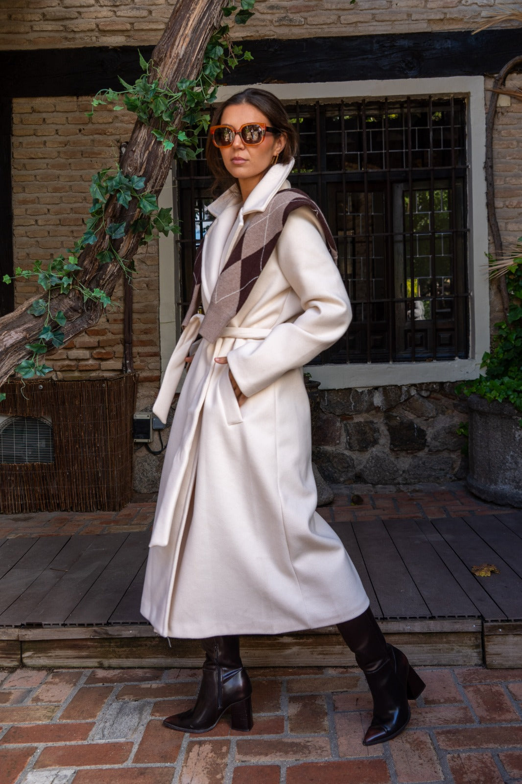 Abrigo largo, tipo paño, calentito, cuello solapa, bolsillos laterales y cinturón. En color beige.