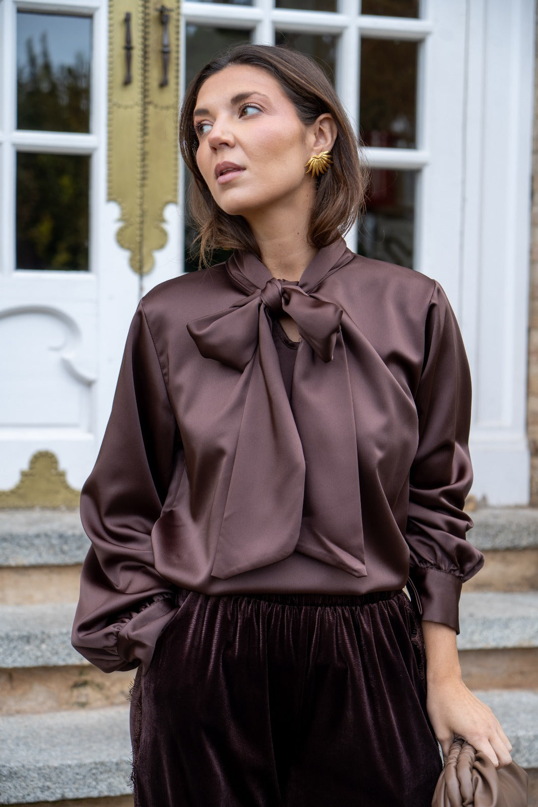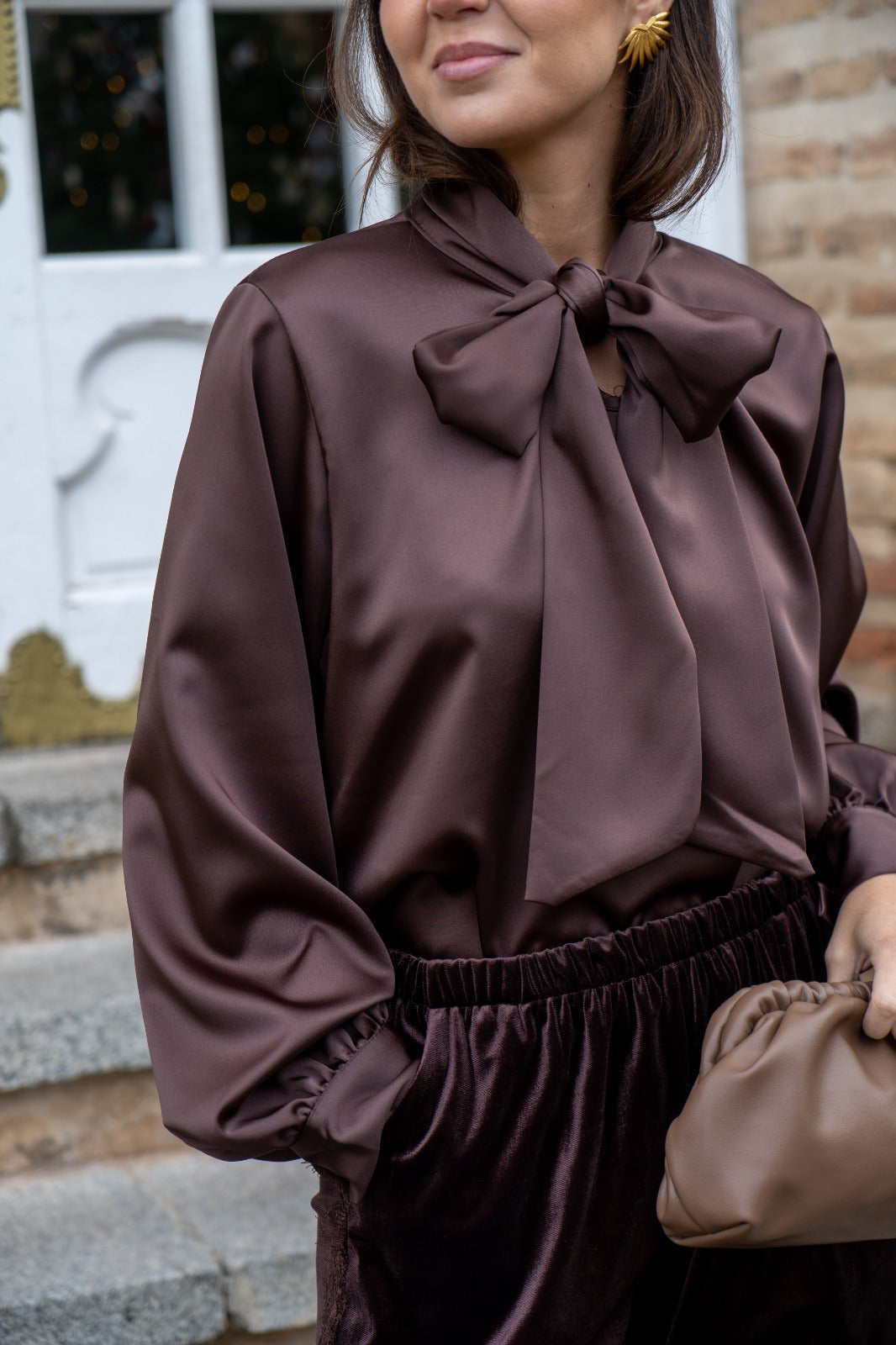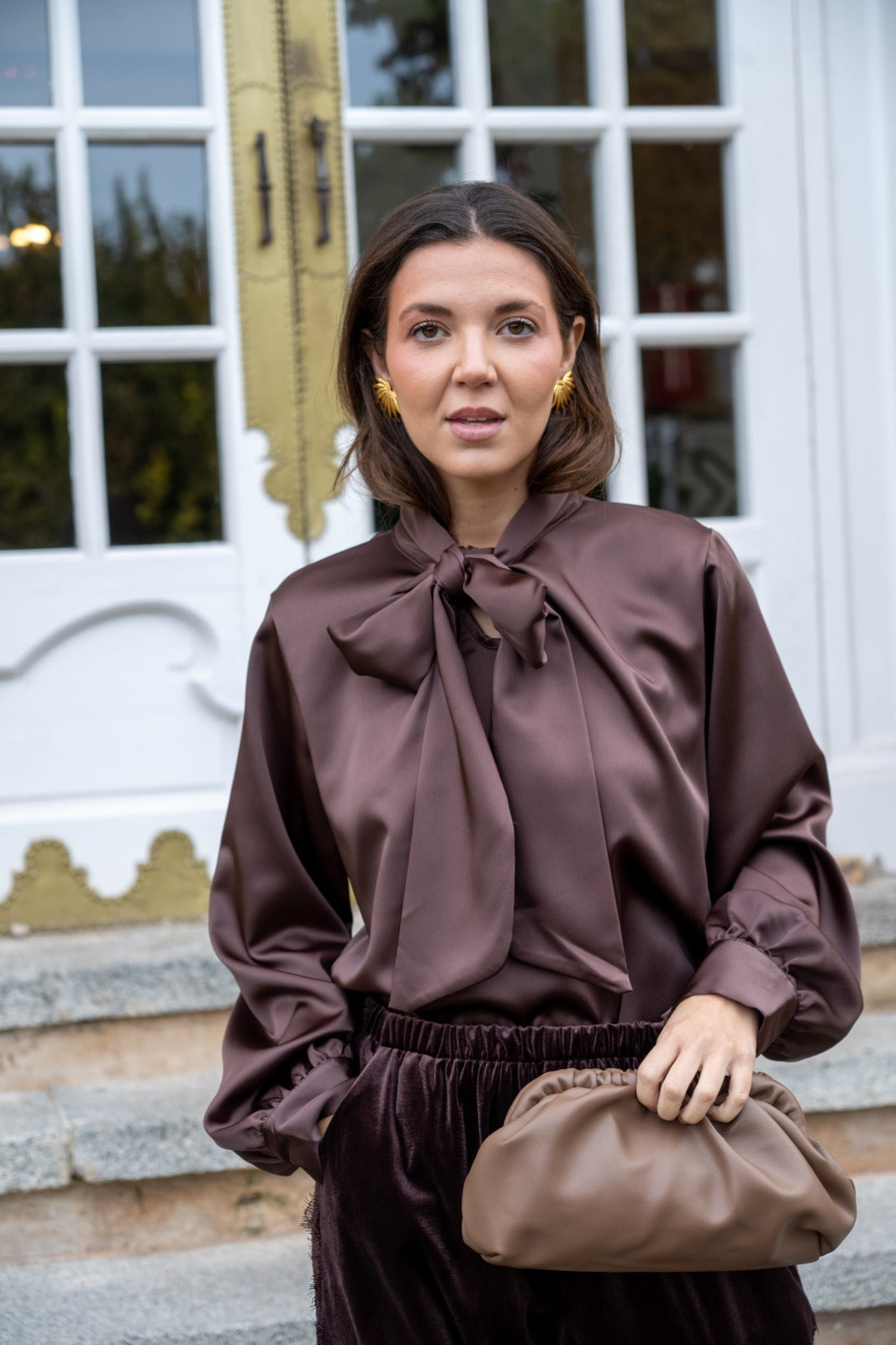 Blusa escote a pico, lazo en el cuello para anudar, manga larga con puño, en satén marrón.