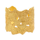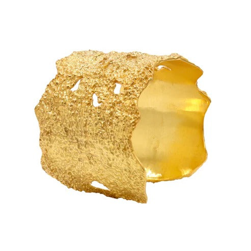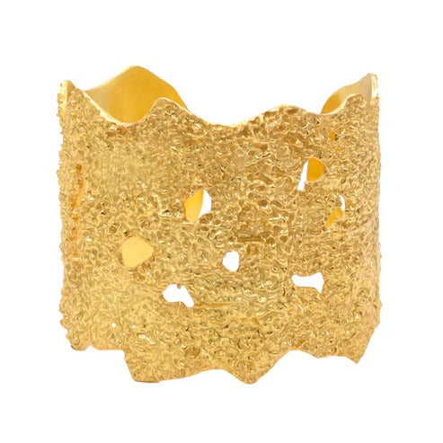 Brazalete dorado con relieve y varios huecos en su superficie, rígido en color dorado.