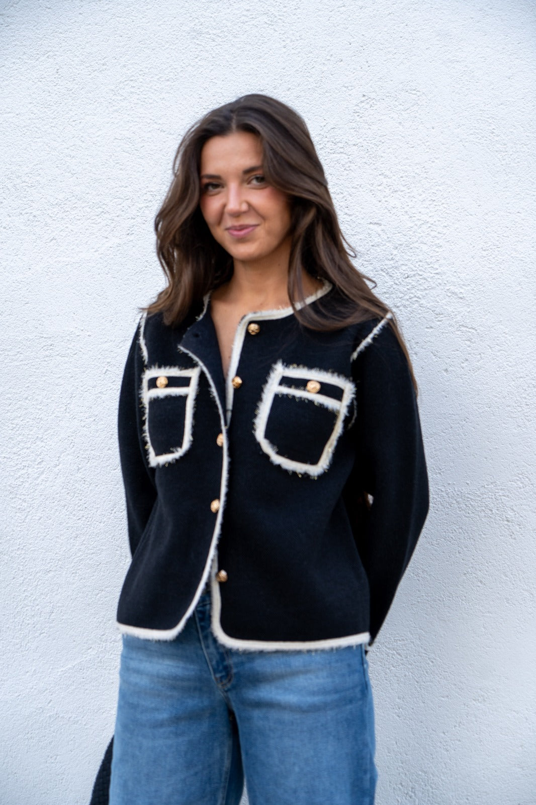 Chaqueta corta, escote redondo, manga larga, abotonada, bolsillos delanteros. En color negro con detalles beiges y lurex dorado.