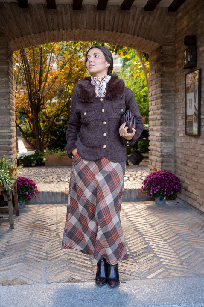 Chaqueta abotonada, tapetas delanteras, cuello piel desmontable, en color marrón.